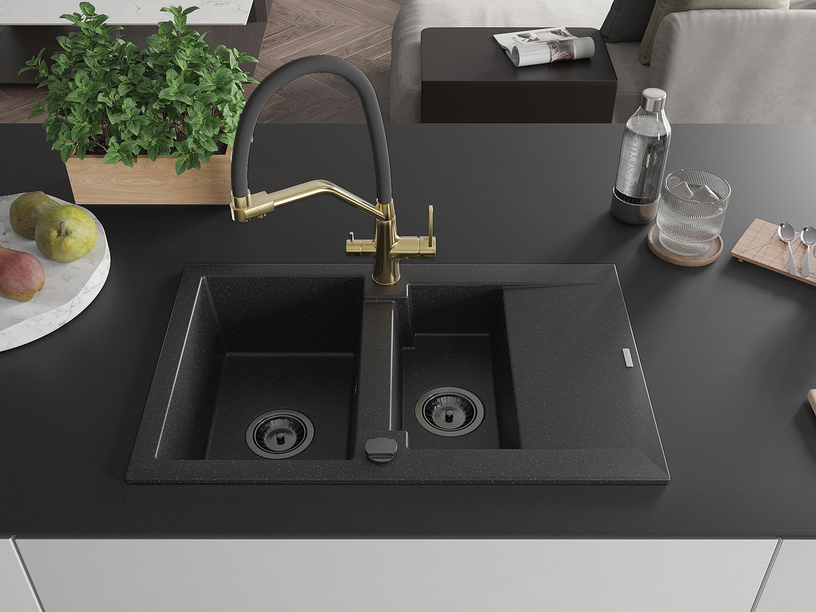 Mexen Gaspar évier en granit 1,5 bac avec égouttoir et robinet de cuisine Duo, noir/argent - 6507-73-671701-57-B