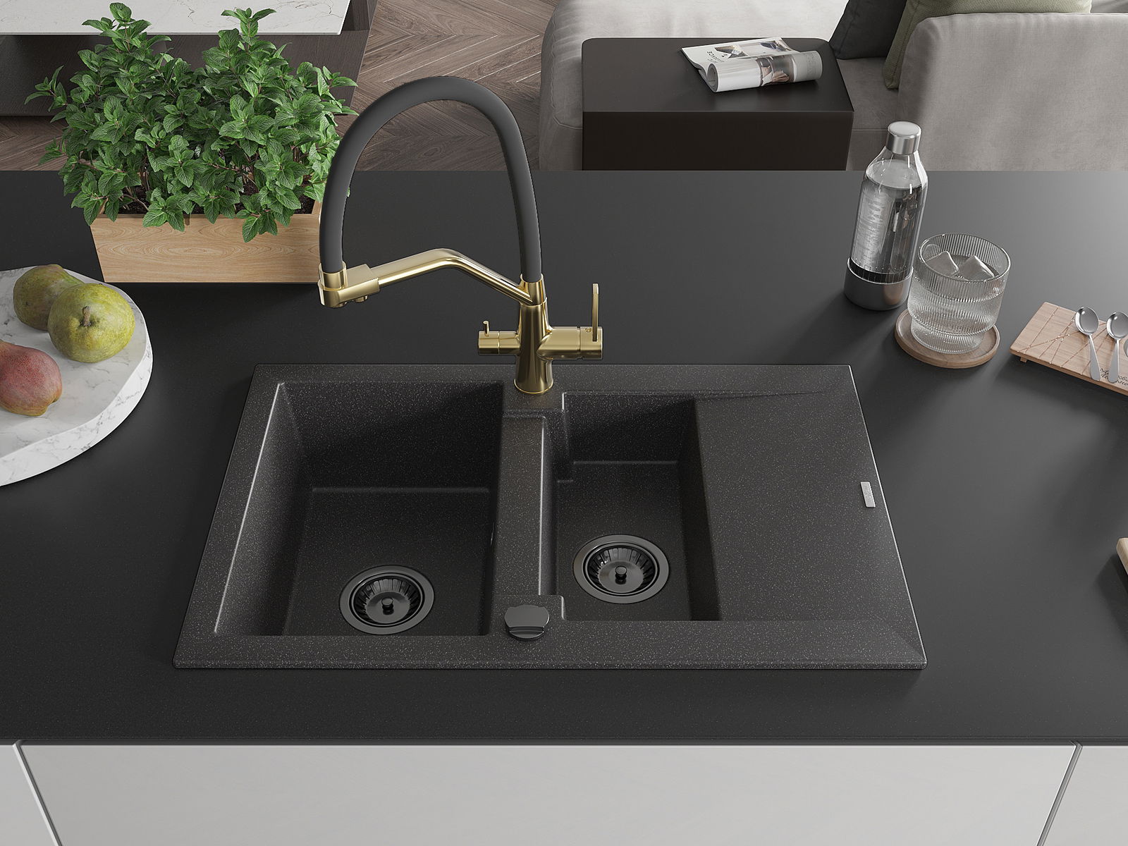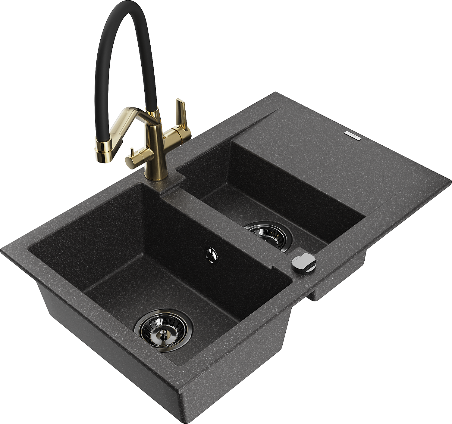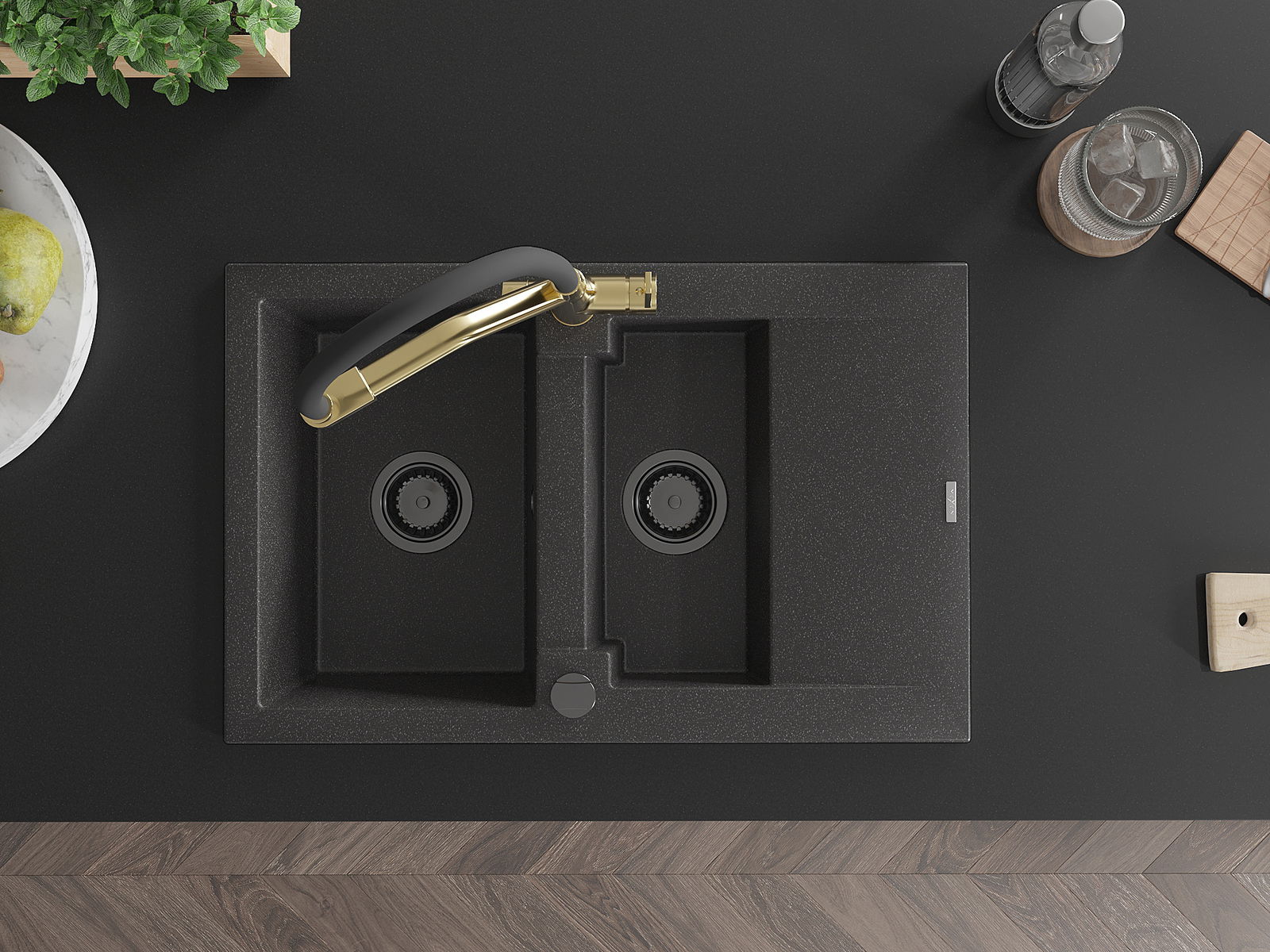 Mexen Gaspar évier en granit 1,5 bac avec égouttoir et robinet de cuisine Duo, noir moucheté - 6507-76-671701-57-B