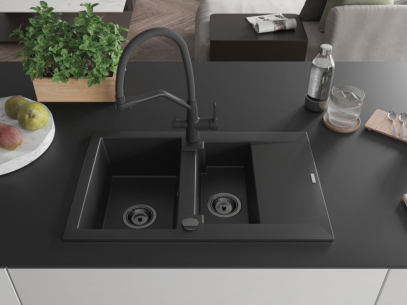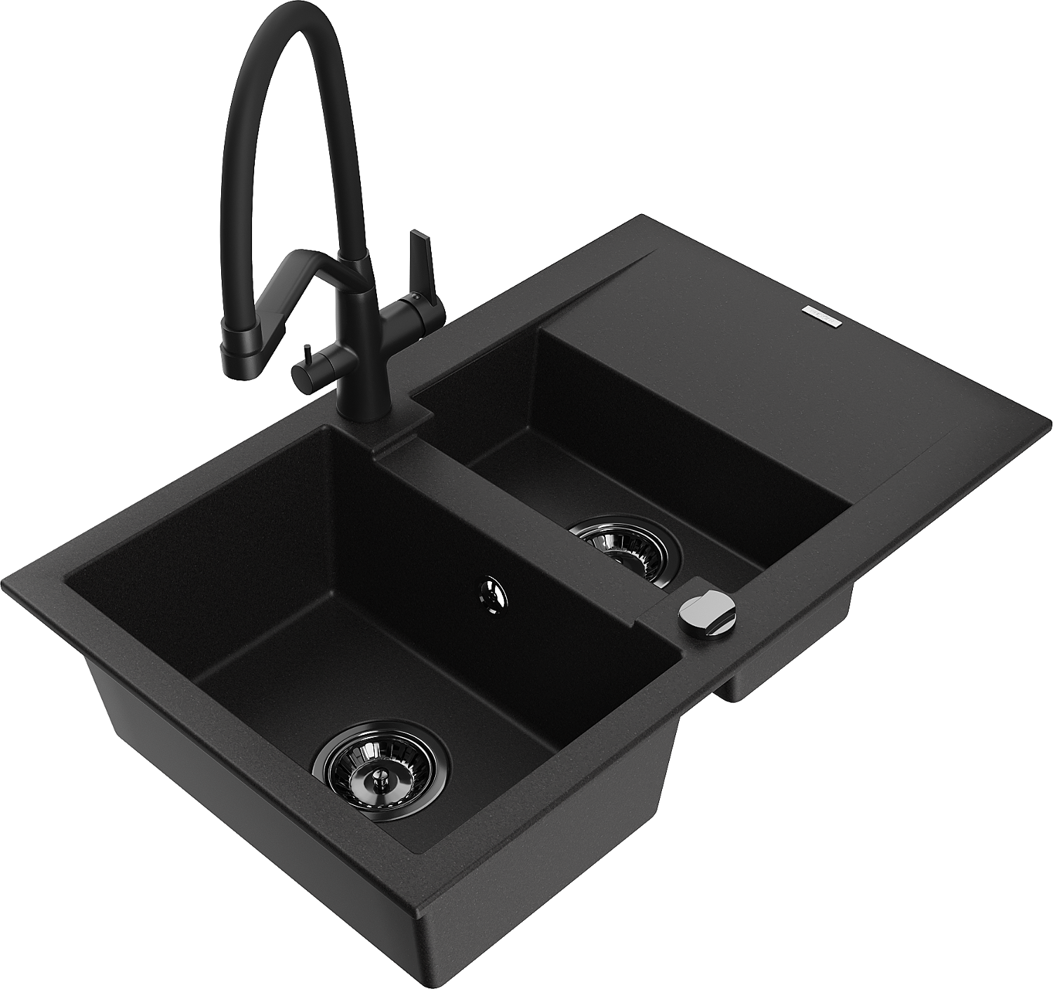 Mexen Gaspar évier de cuisine en granit 1,5 bac avec égouttoir et robinet de cuisine Duo, noir - 6507-77-671701-70-B