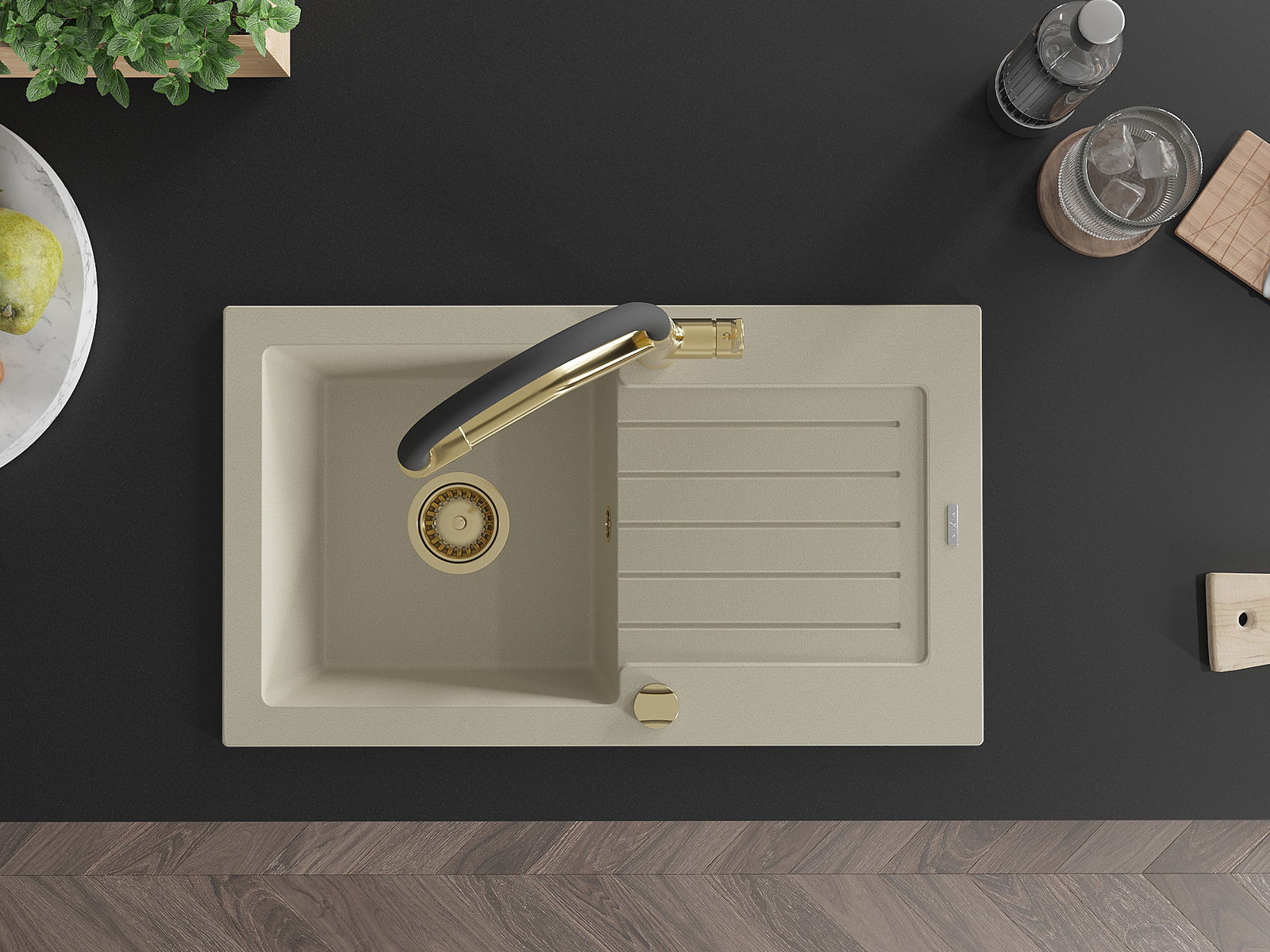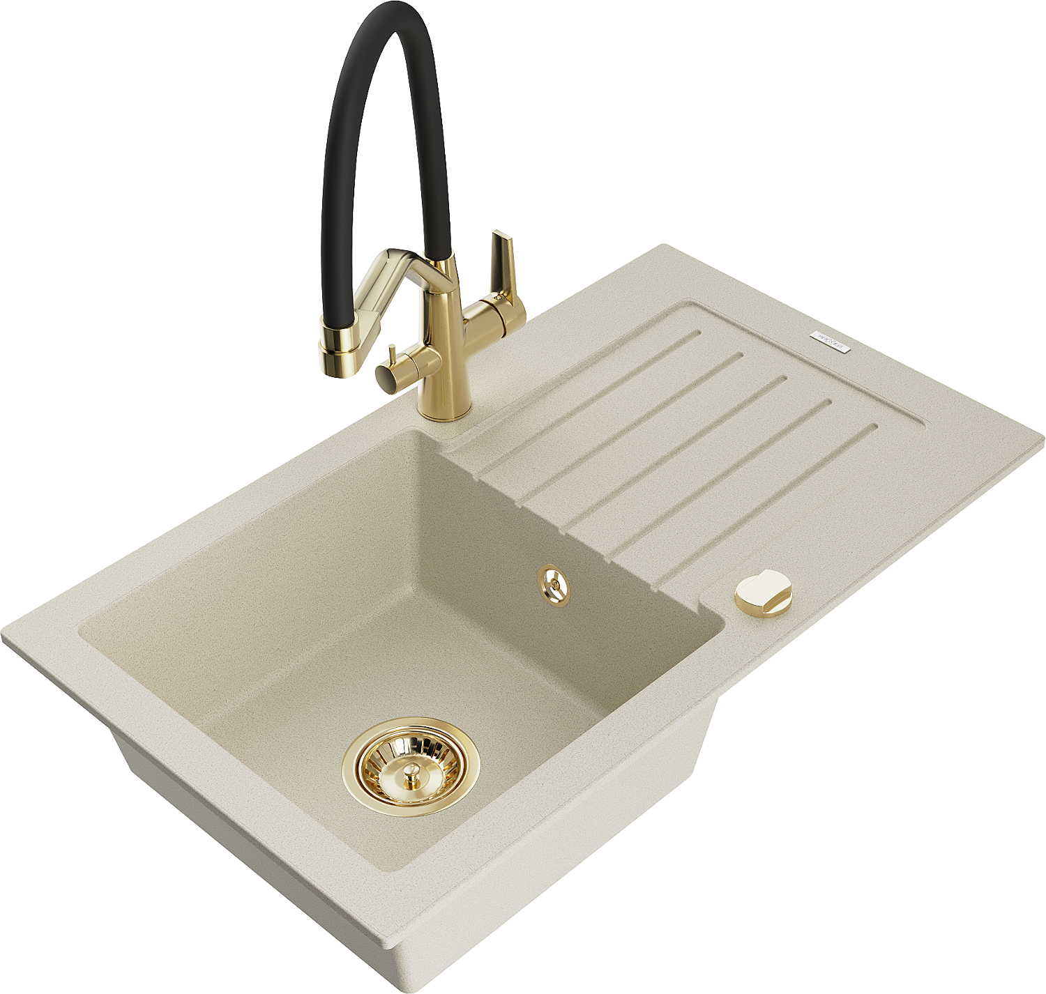 Mexen Pablo évier en granit à 1 bac avec égouttoir et robinet de cuisine Duo, beige - 6510-69-671701-57-G