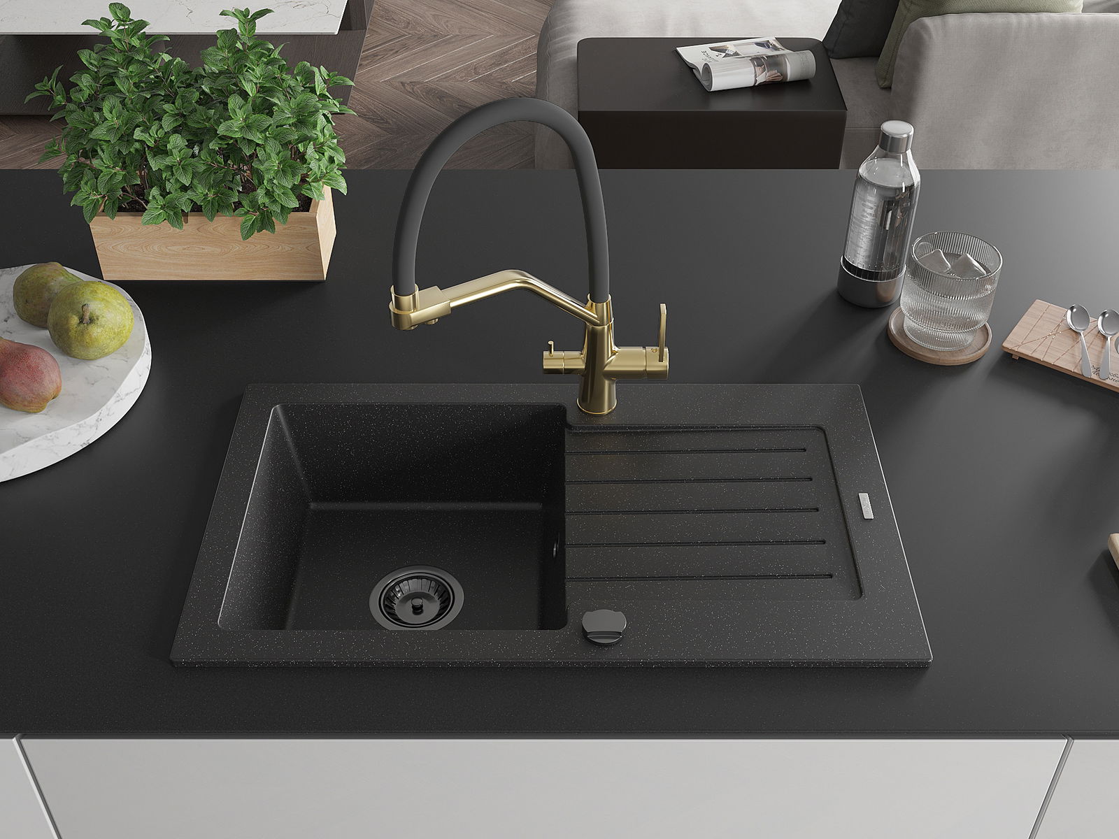 Mexen Pablo évier en granit 1 bac avec égouttoir et robinet de cuisine Duo, noir/argent métallisé - 6510-73-671701-57-B