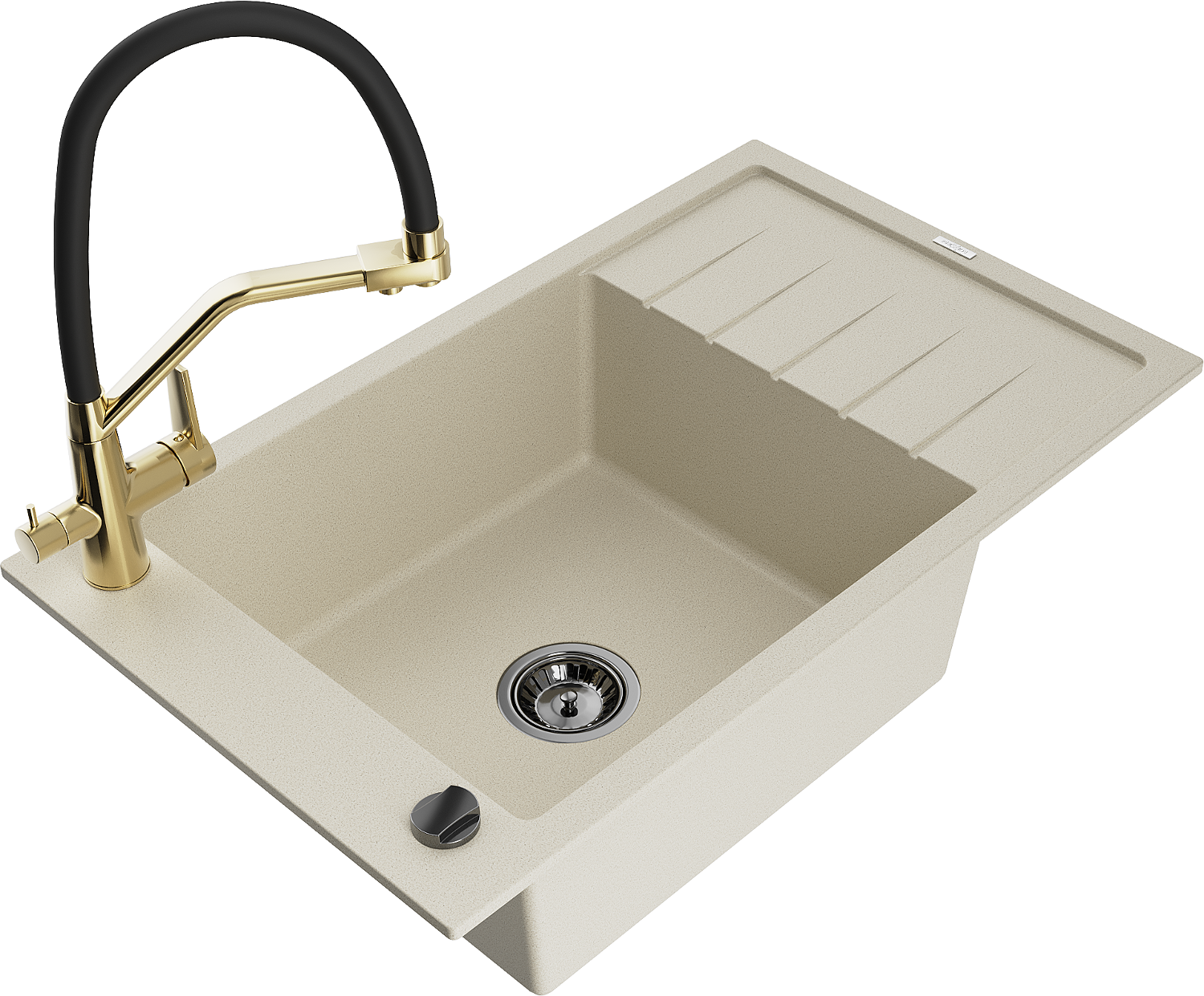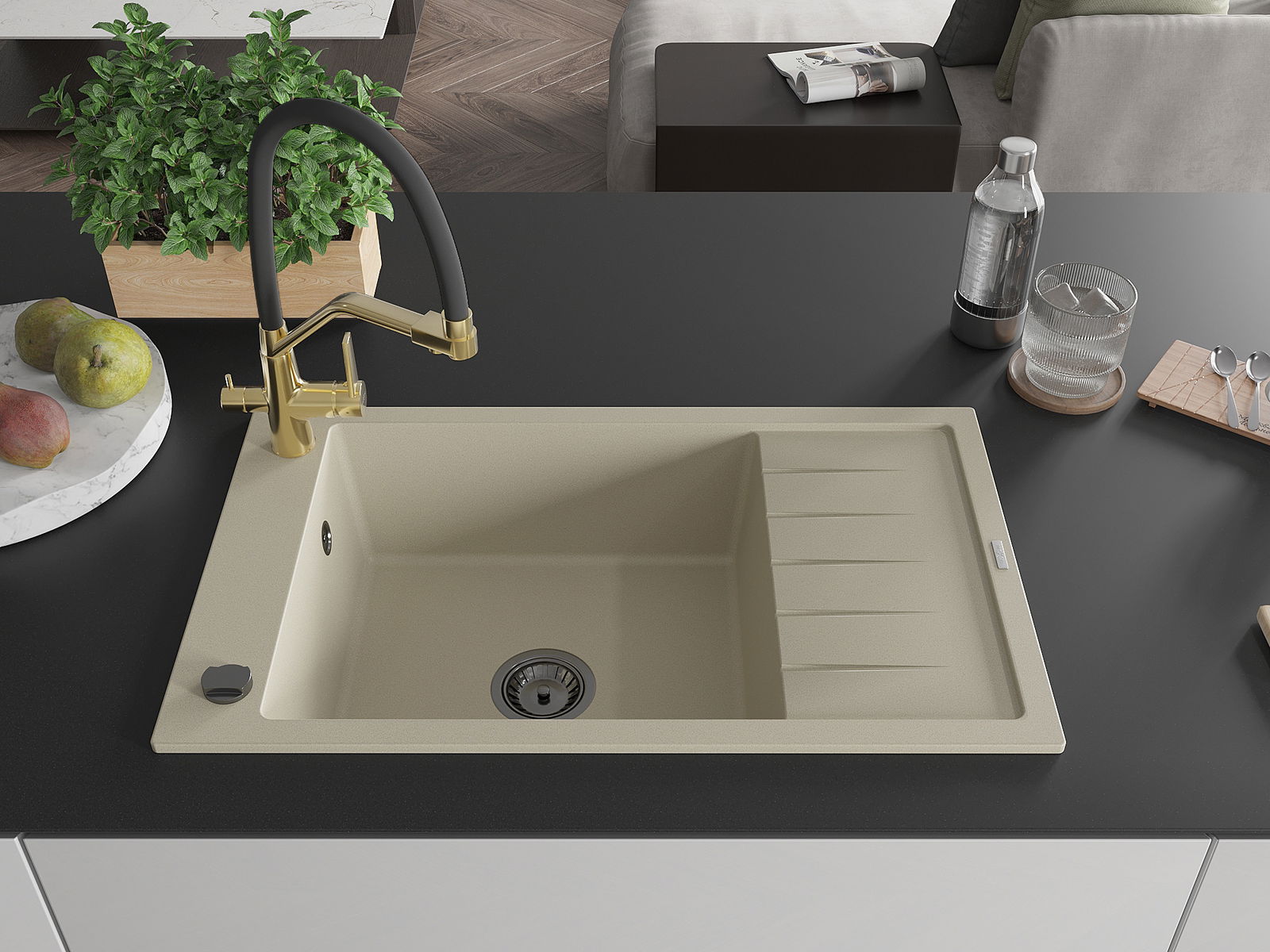 Mexen Elias évier en granit 1 bac avec égouttoir et robinet de cuisine Duo, beige - 6511-69-671701-57-B