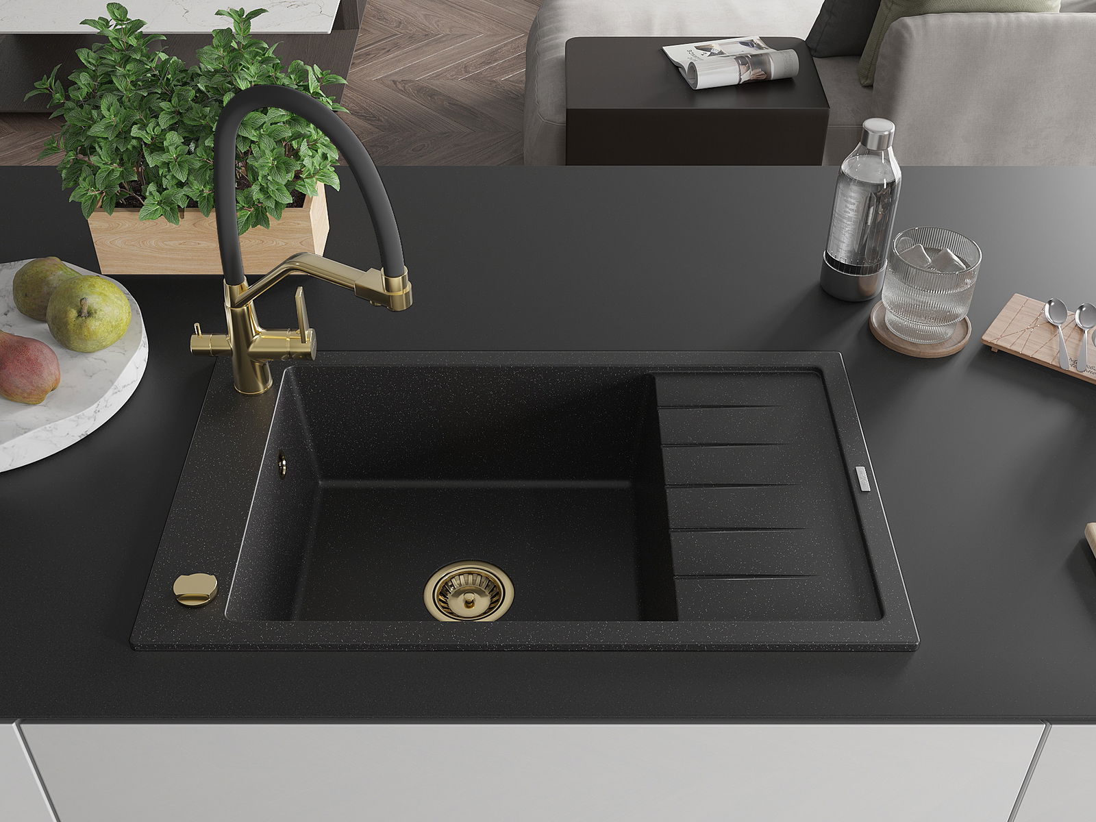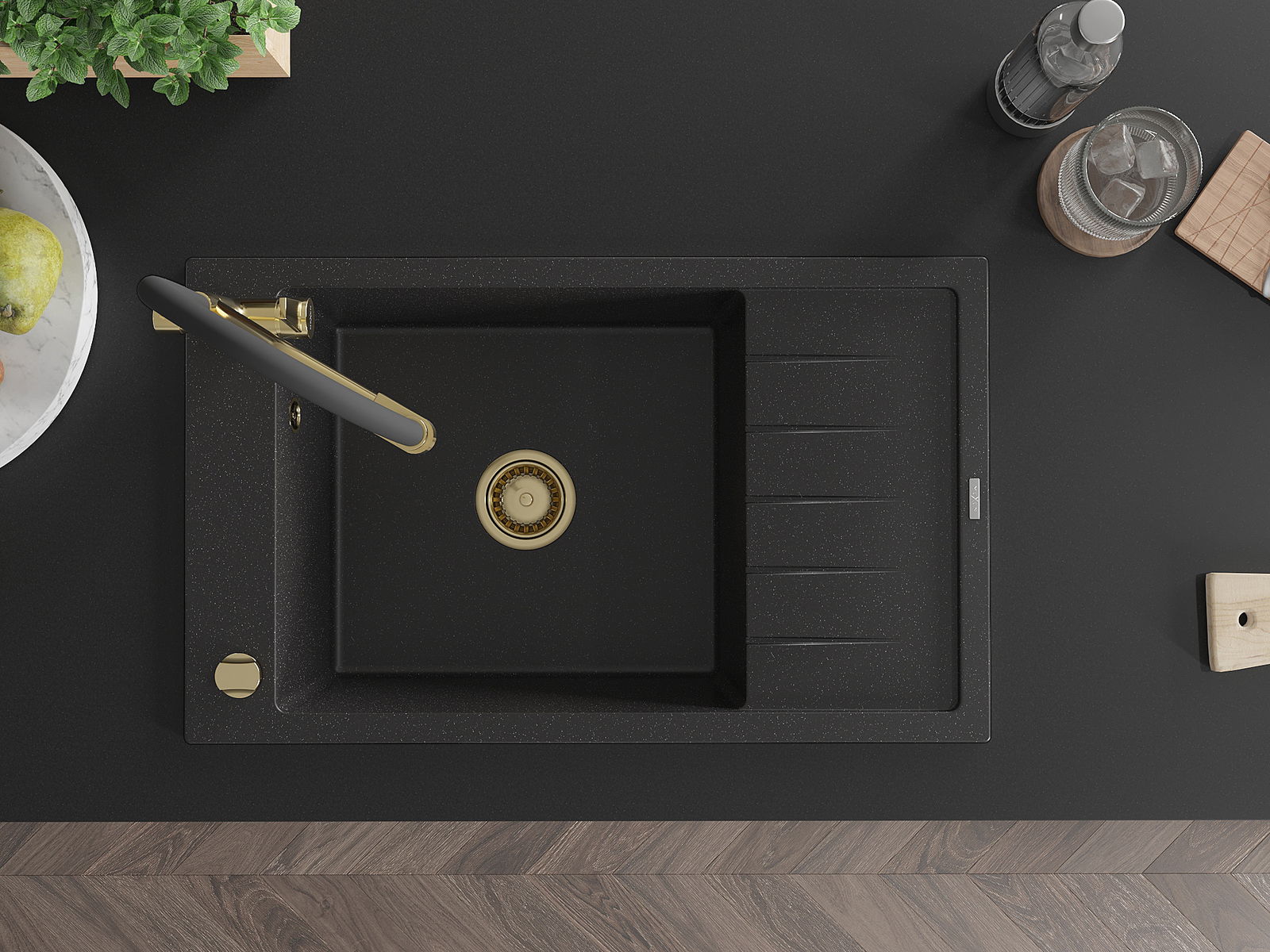 L'évier a un trou sous-meulé de 35 mm de diamètre à percer soi-même. Il peut être utilisé, entre autres, pour installer un distributeur de liquide, ce qui éliminera la présence de bouteilles en plastique dans la cuisine et lui donnera une finition élégante.