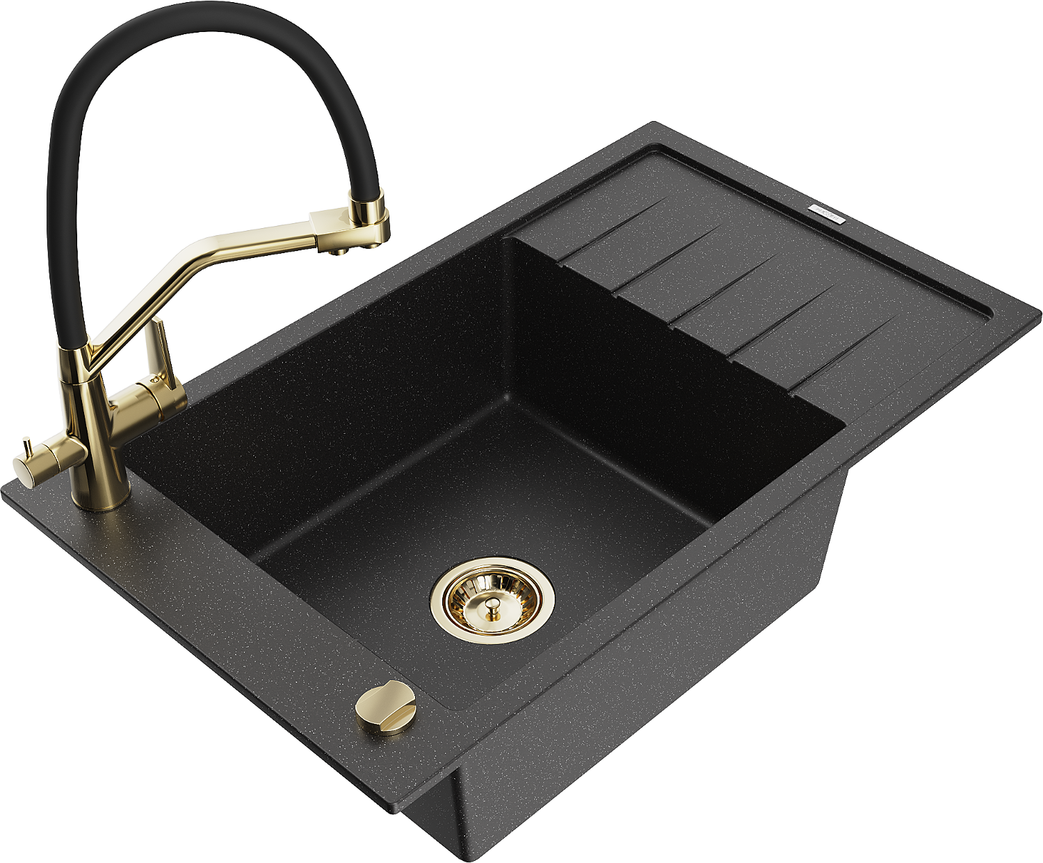 Mexen Elias évier en granit 1 bac avec égouttoir et robinet de cuisine Duo, noir/métallisé argent - 6511-73-671701-57-G