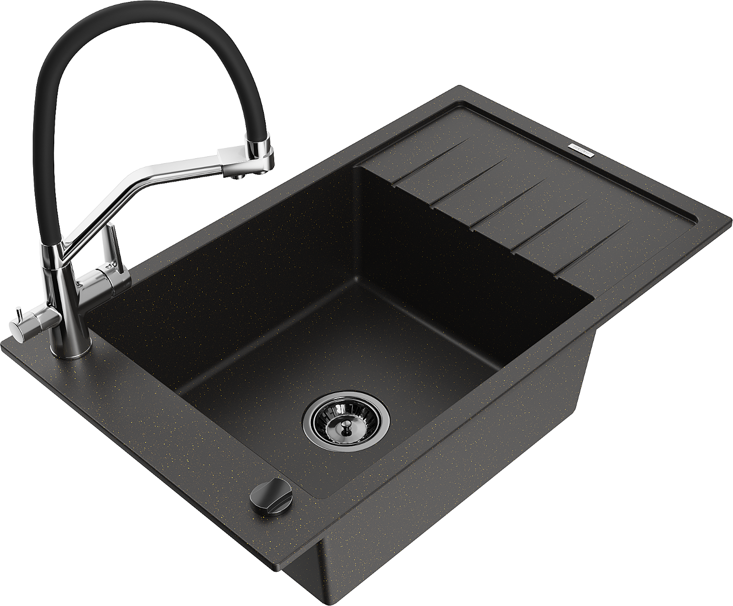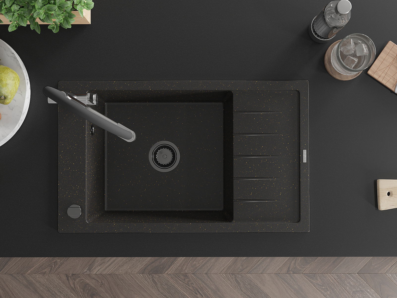 Mexen Elias évier en granit 1 bac avec égouttoir et robinet de cuisine Duo, noir/or métallisé - 6511-75-671701-07-B