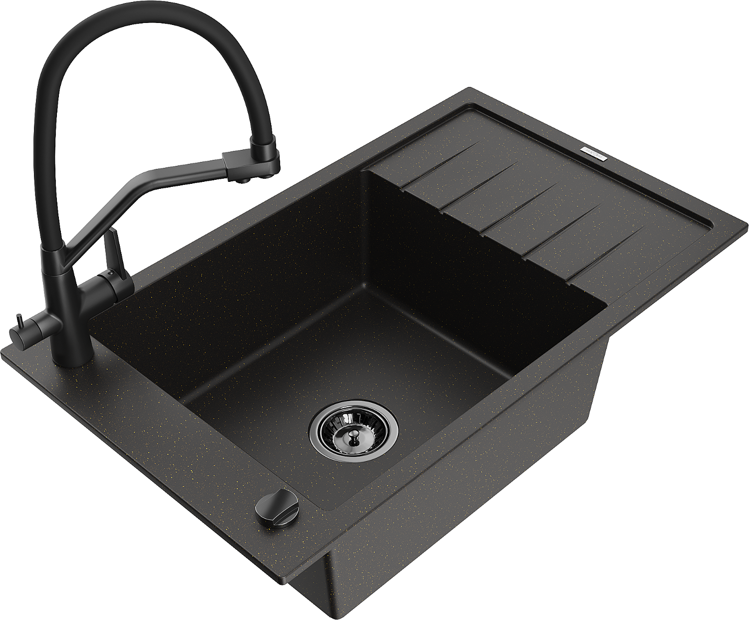 Mexen Elias évier en granit 1 bac avec égouttoir et mitigeur de cuisine Duo, noir/métallique doré - 6511-75-671701-70-B