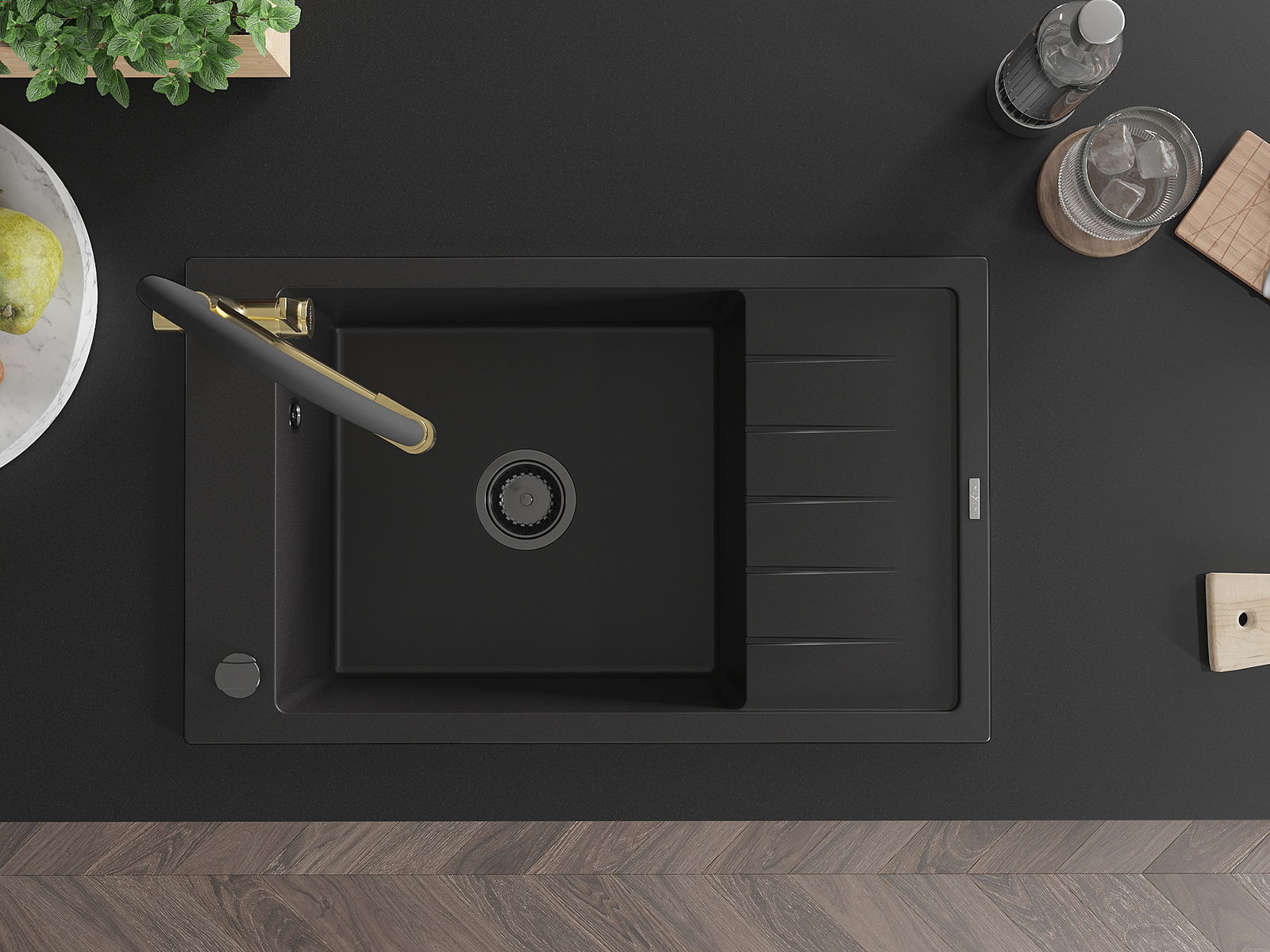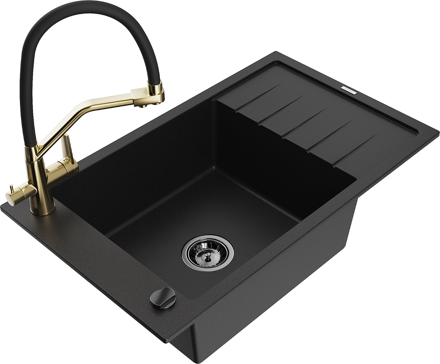Mexen Elias évier en granit 1 bac avec égouttoir et mitigeur de cuisine Duo, noir - 6511-77-671701-57-B