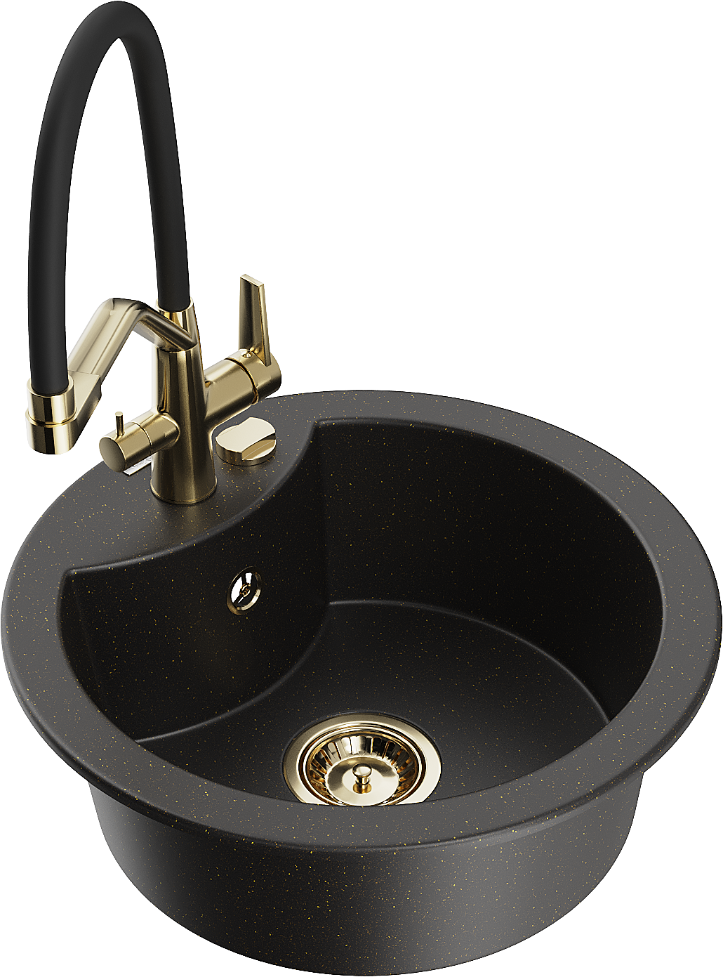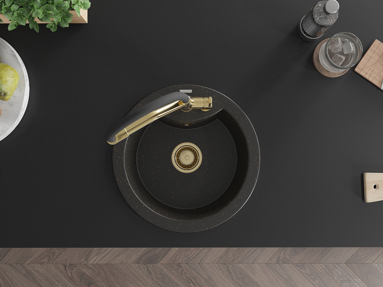 Mexen Diego évier de cuisine en granit 1 bac avec robinet de cuisine Duo, noir/or métallique - 6512-75-671701-57-G