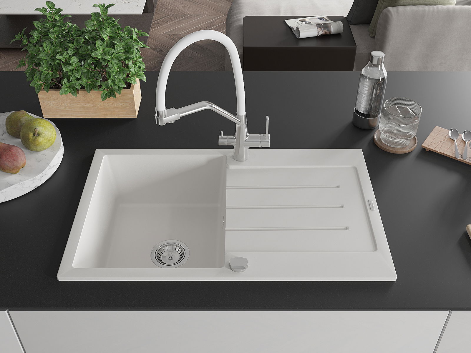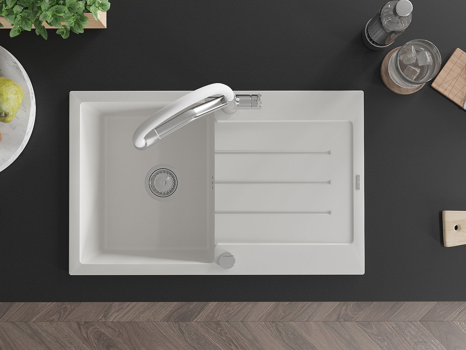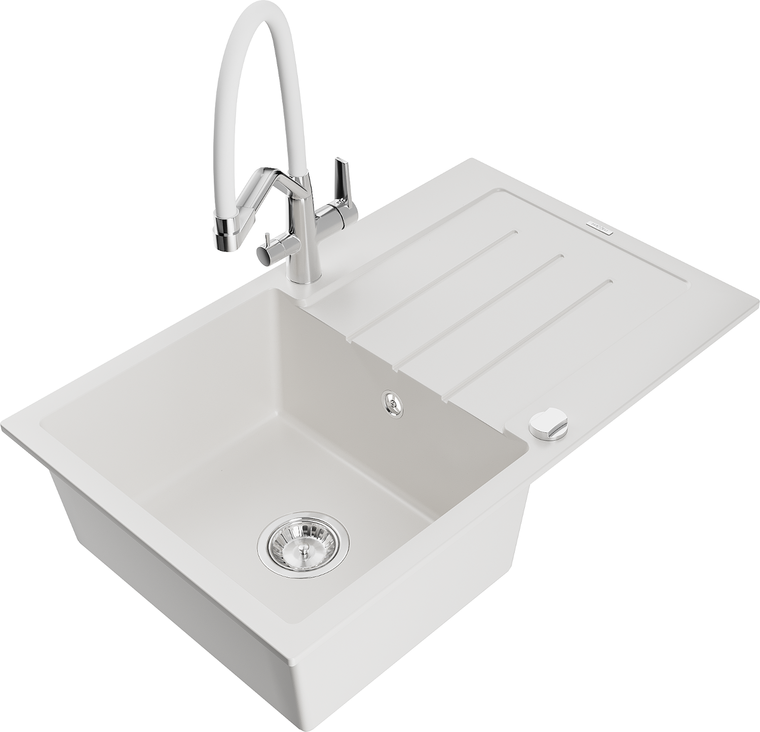 Mexen Bruno évier en granit à 1 cuve avec égouttoir et robinet de cuisine Duo, blanc - 6513-20-671701-02