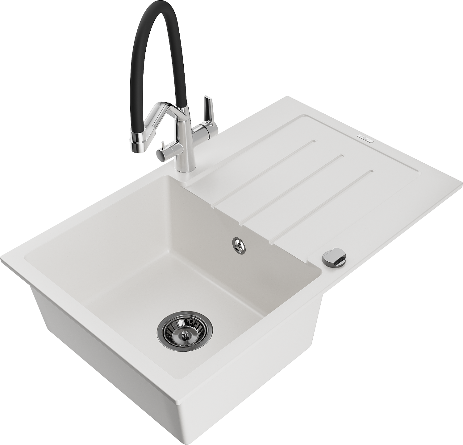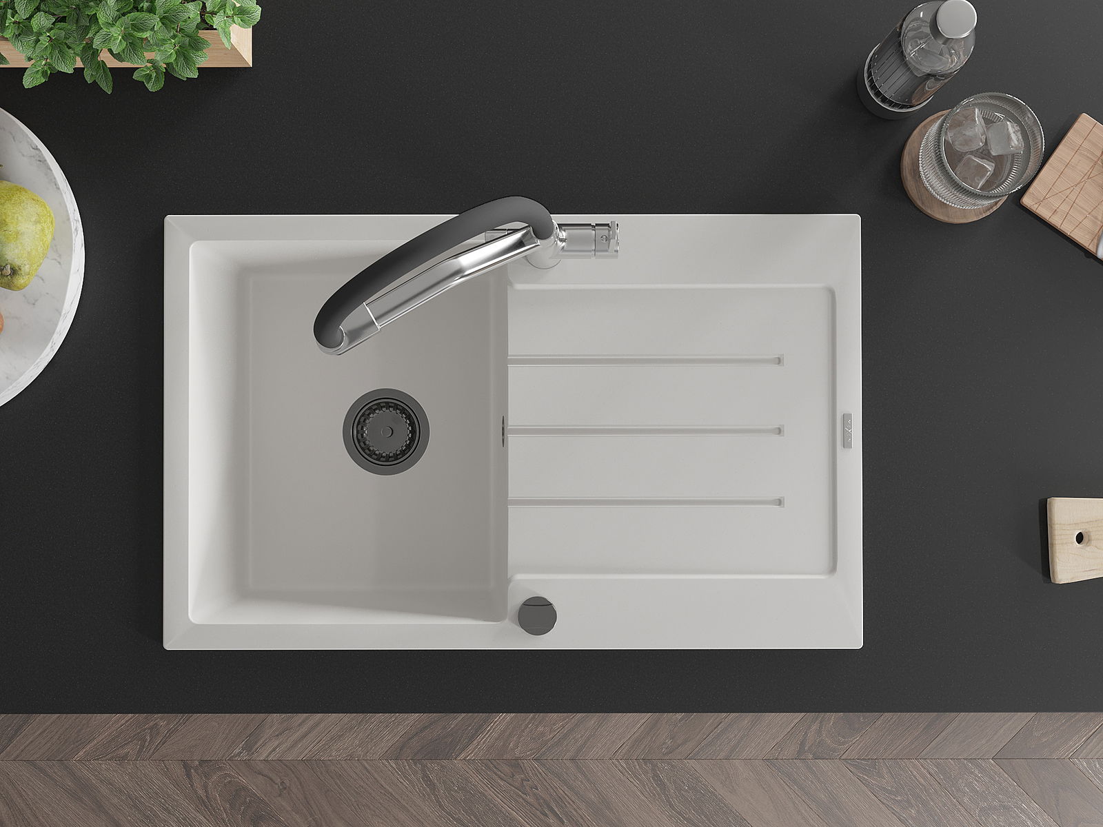 Mexen Bruno évier en granit à 1 bac avec égouttoir et mitigeur de cuisine Duo, blanc - 6513-20-671701-07-B