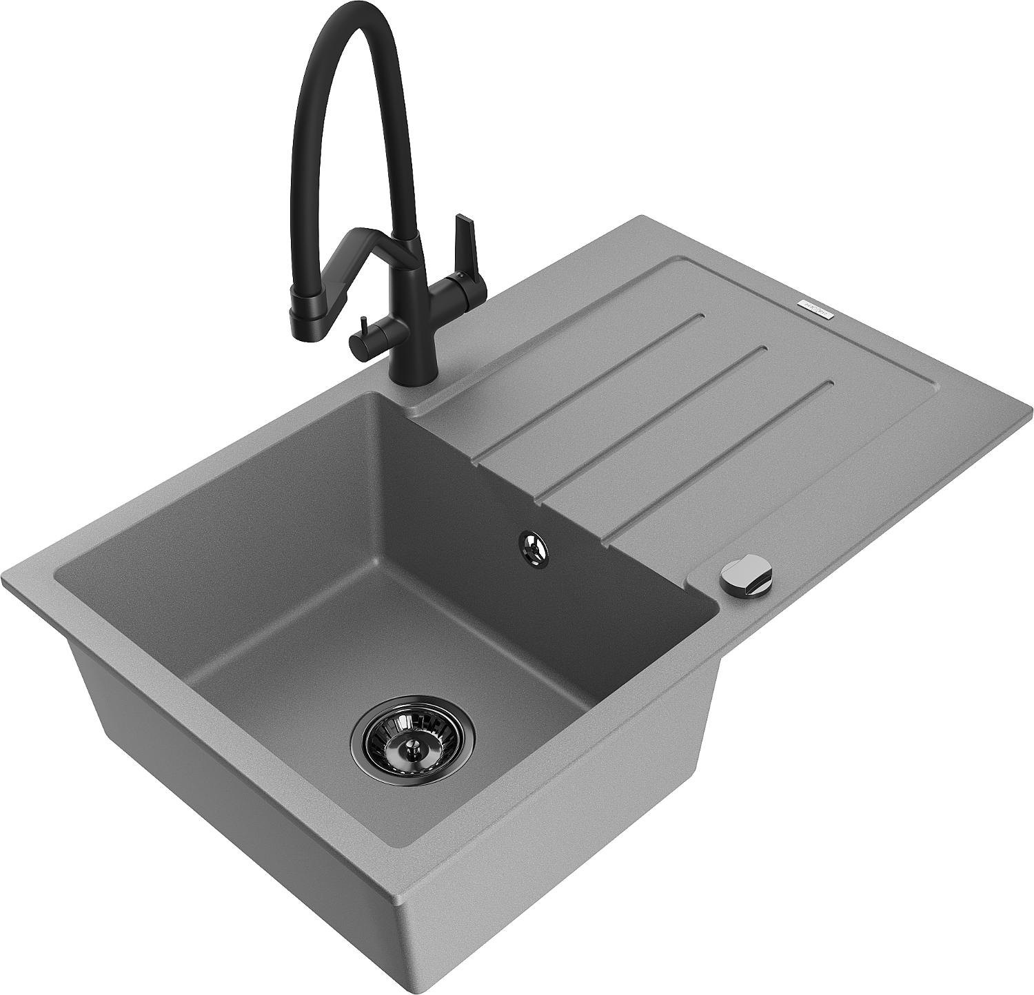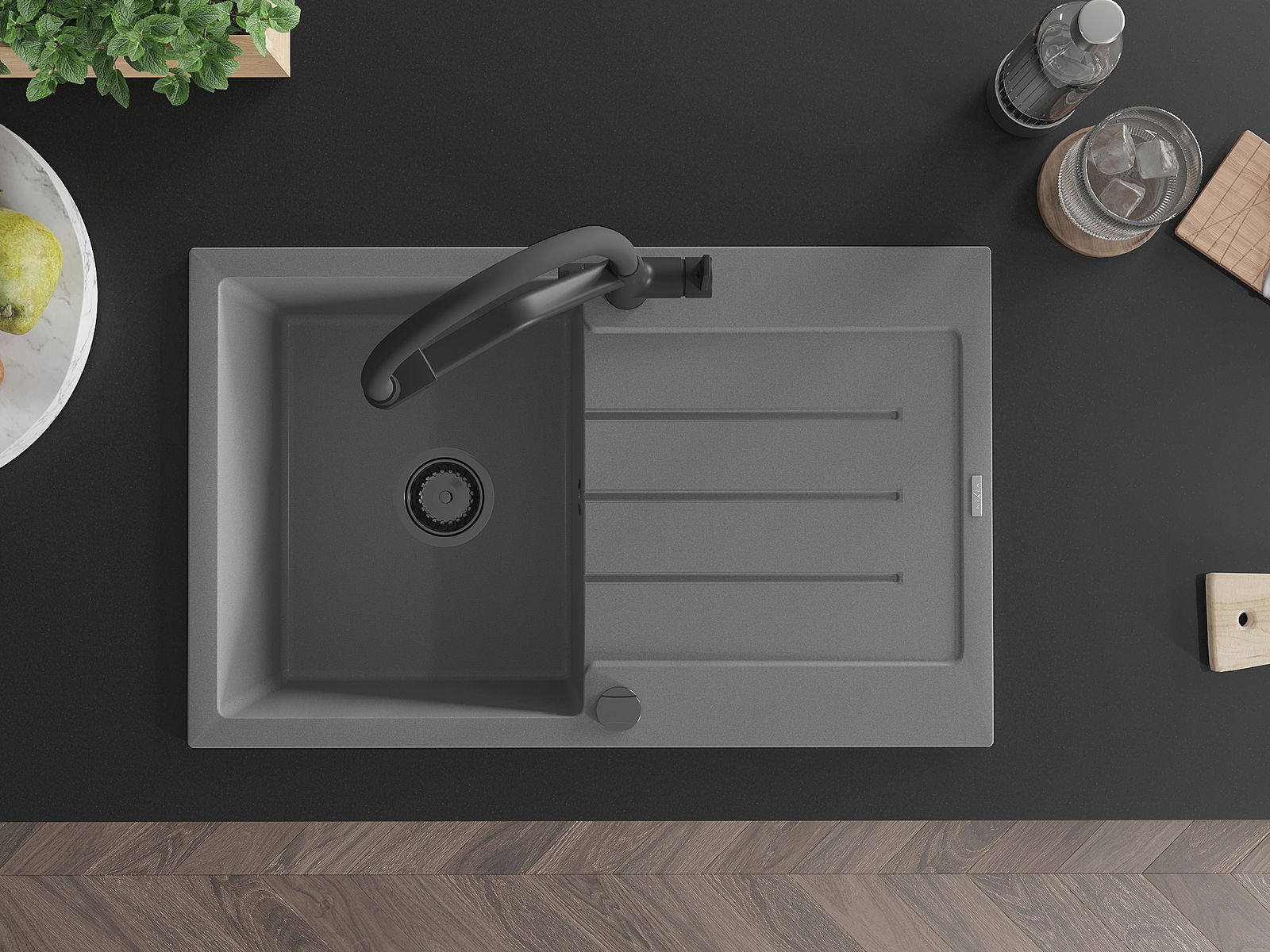 Mexen Bruno évier en granit à 1 bac avec égouttoir et robinet de cuisine Duo, gris - 6513-71-671701-70-B