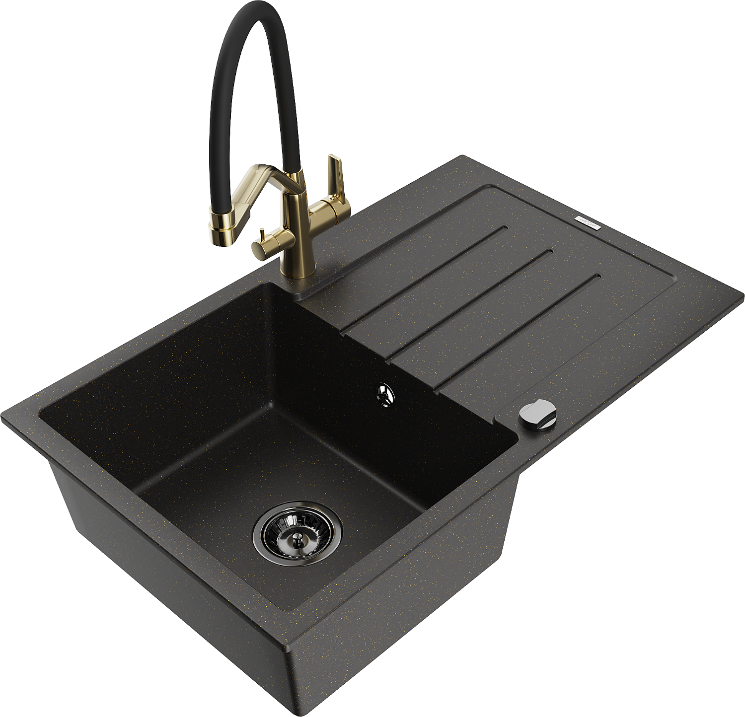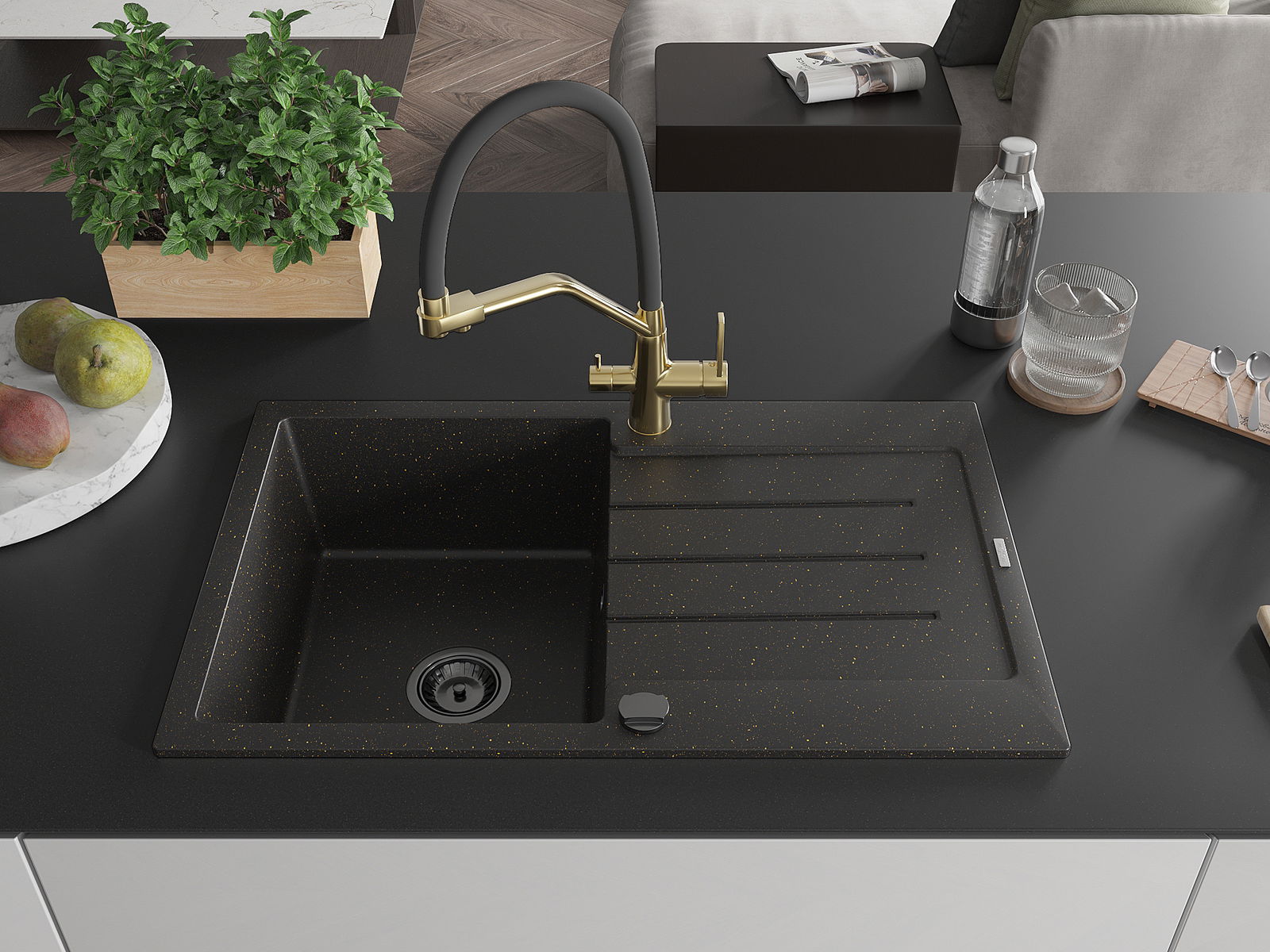Mexen Bruno évier en granit 1 cuve avec égouttoir et robinet de cuisine Duo, noir/or métallique - 6513-75-671701-57-B