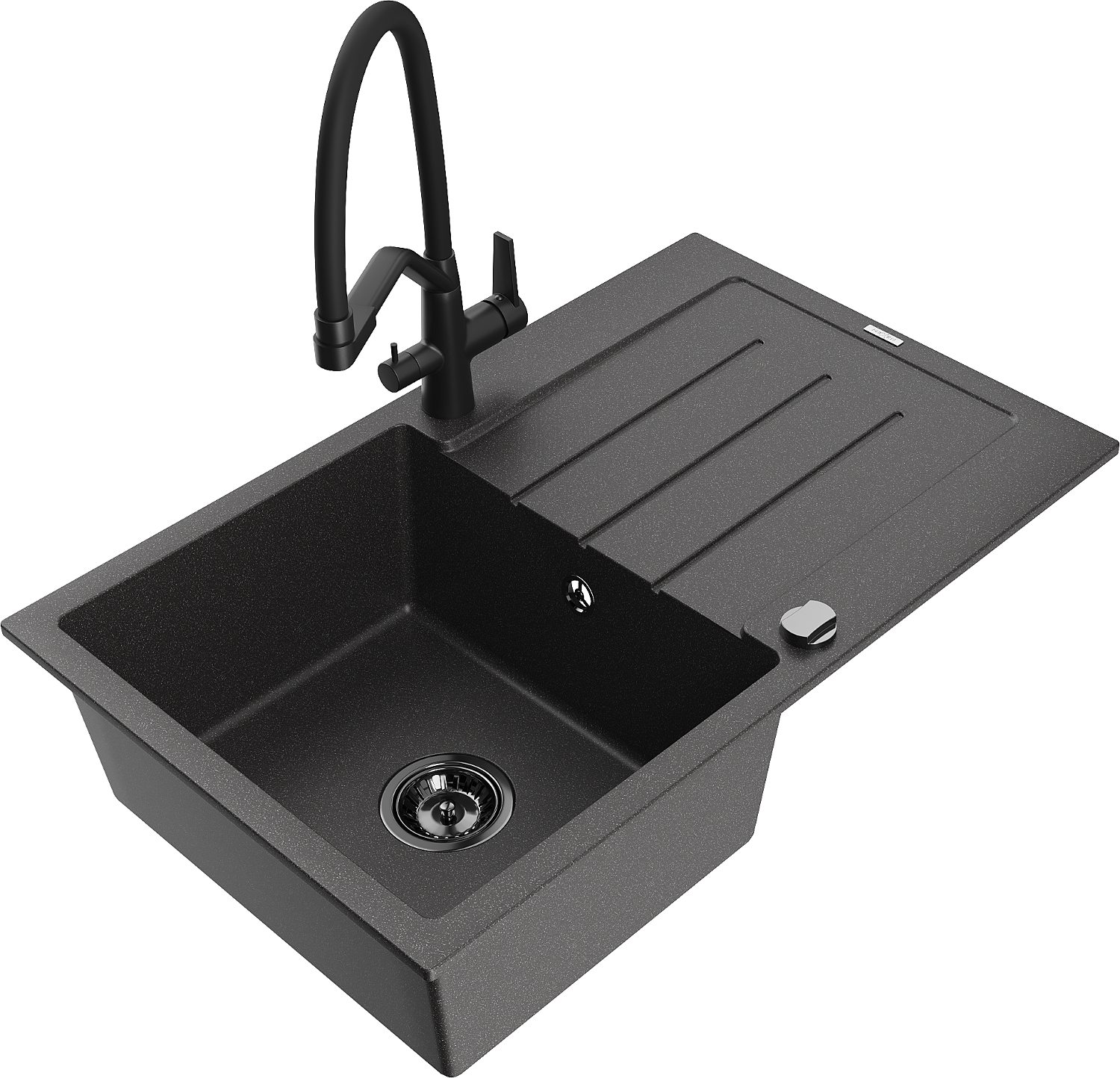 Mexen Bruno évier en granit 1 cuve avec égouttoir et robinet de cuisine Duo, noir moucheté - 6513-76-671701-70-B