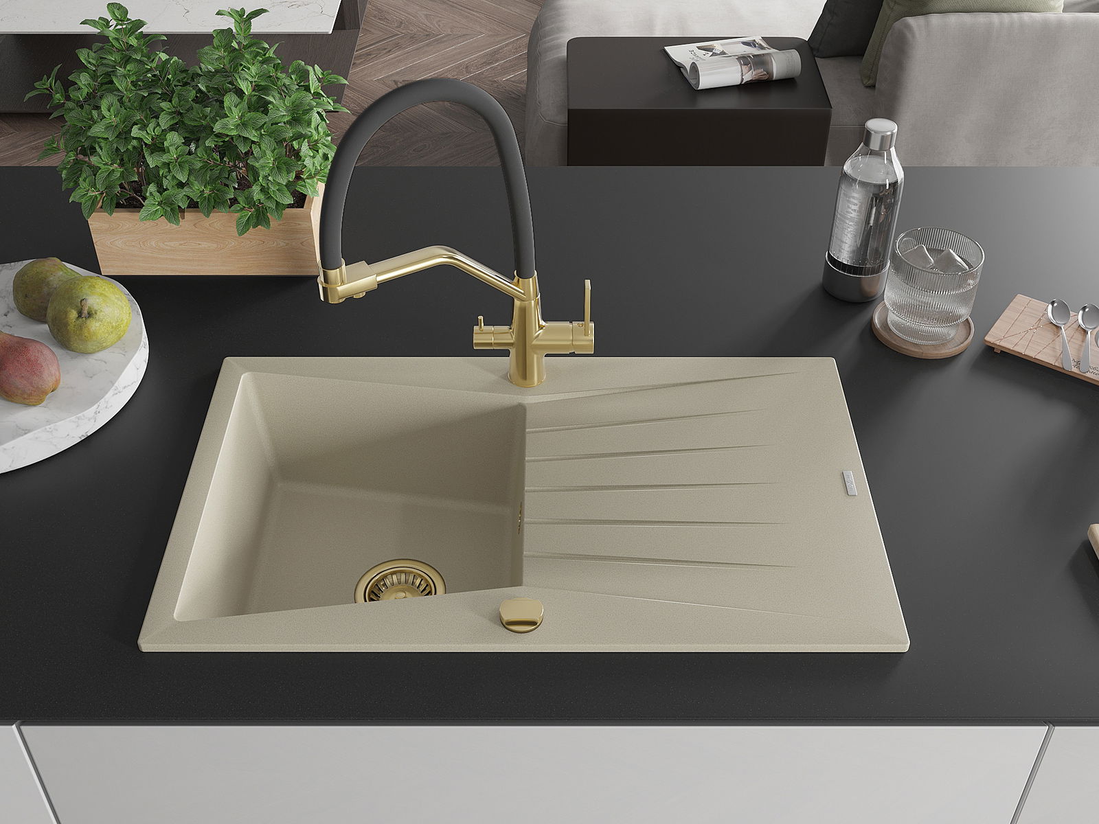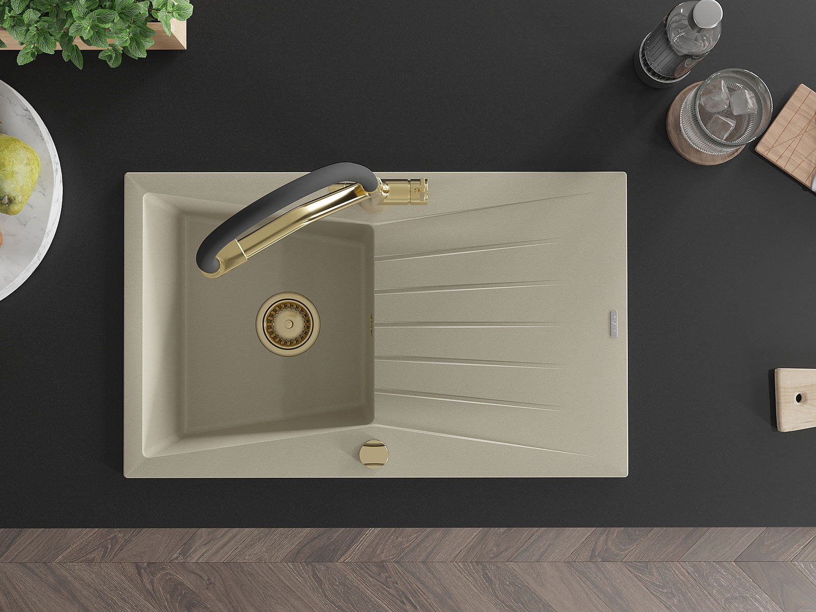 Mexen Cesar évier en granit 1 cuve avec égouttoir et robinet de cuisine Duo, beige - 6514-69-671701-57-G