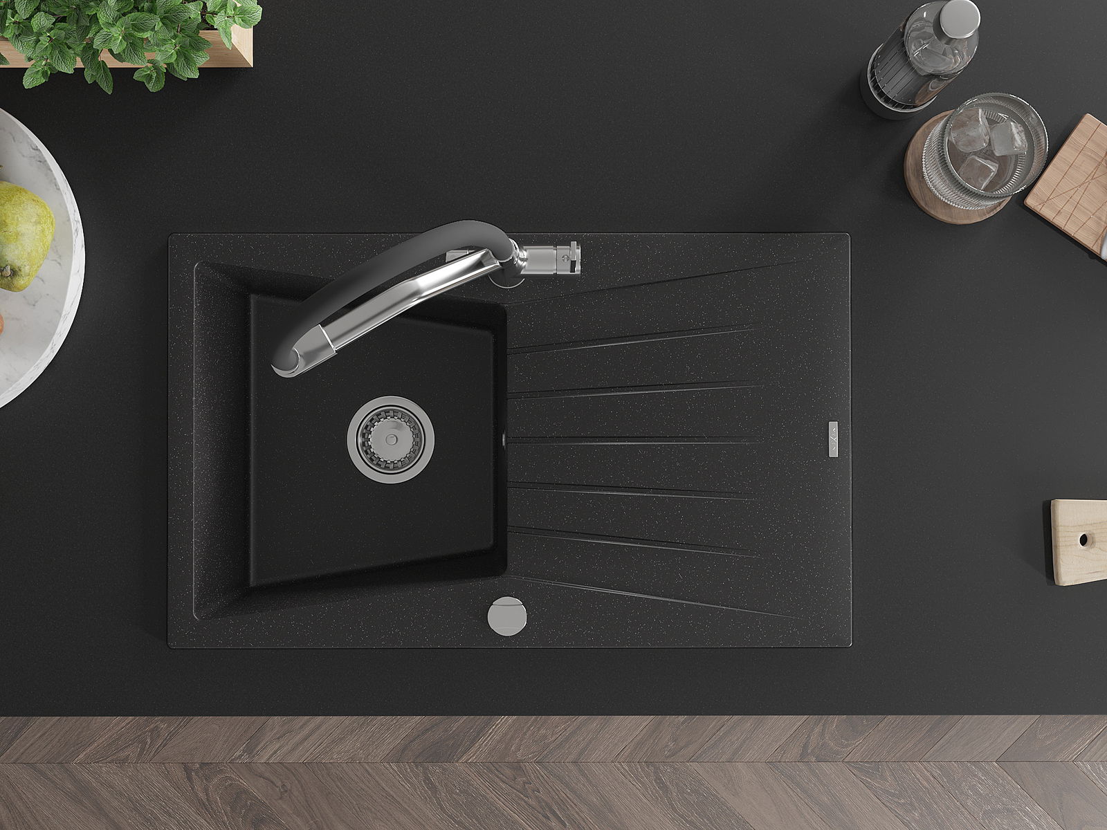Mexen Cesar évier en granit à 1 bac avec égouttoir et robinet de cuisine Duo, noir/argent métallisé - 6514-73-671701-07