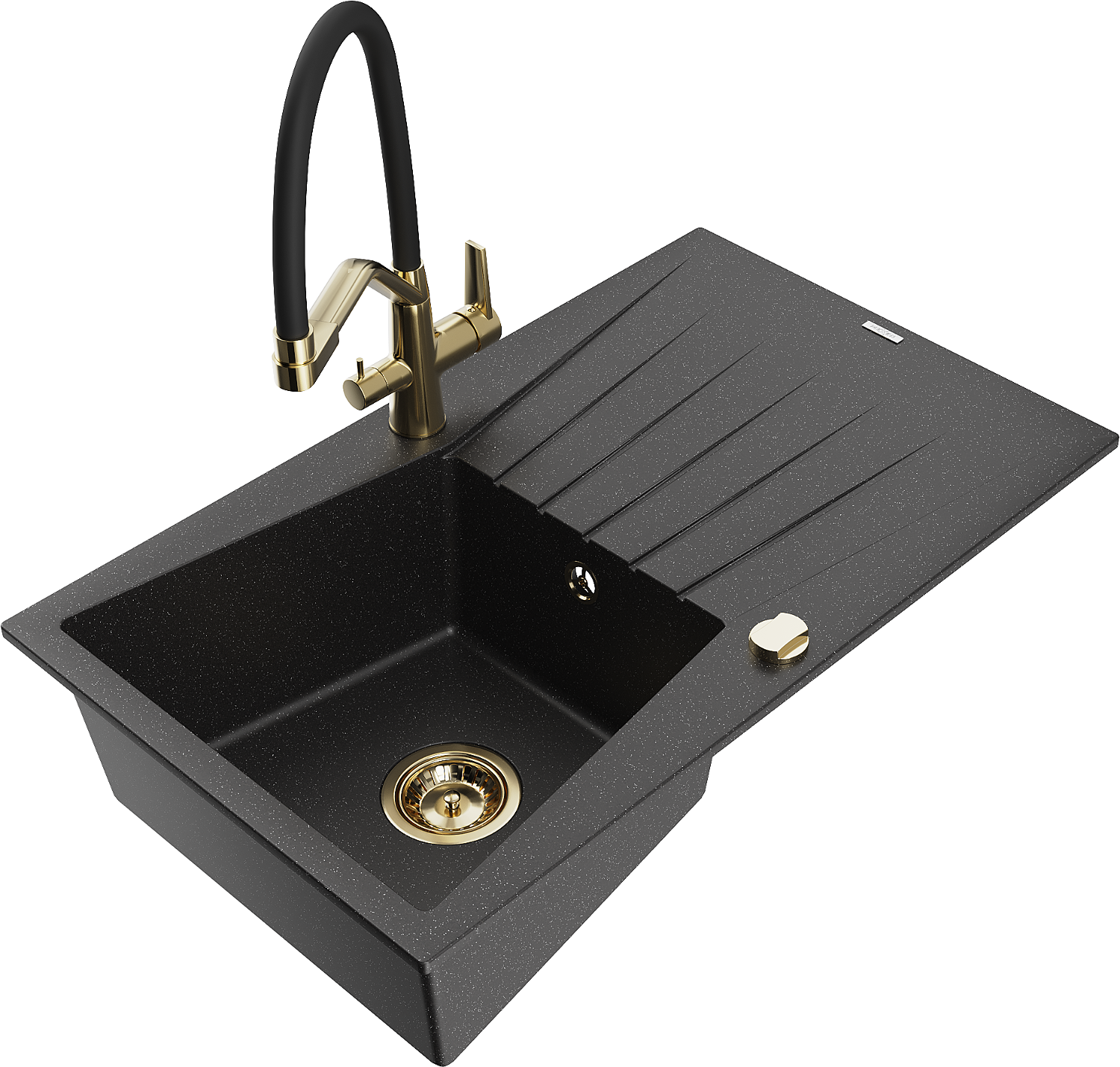 Mexen Cesar évier en granit 1 bac avec égouttoir et robinet de cuisine Duo, noir/argent métallisé - 6514-73-671701-57-G