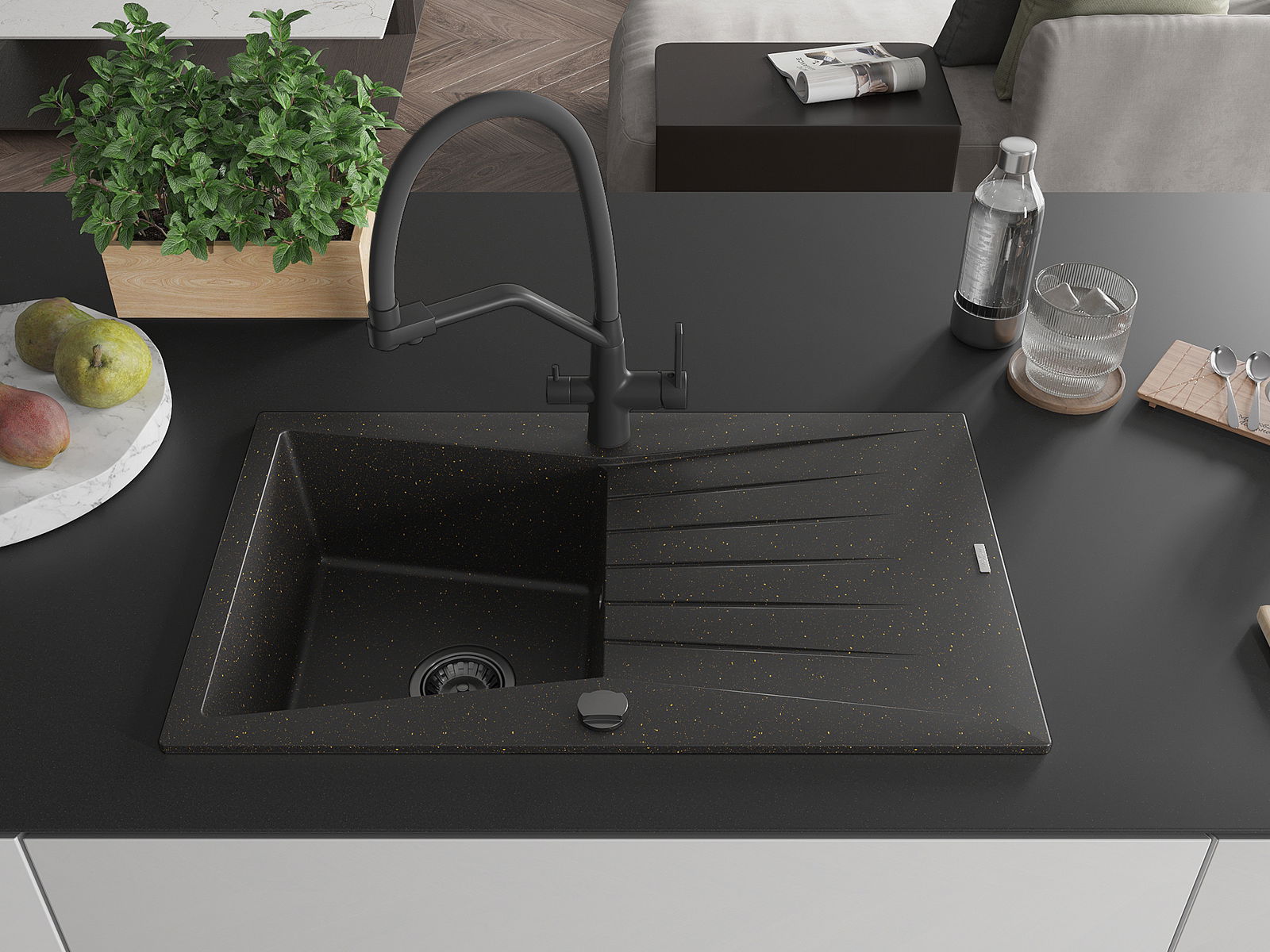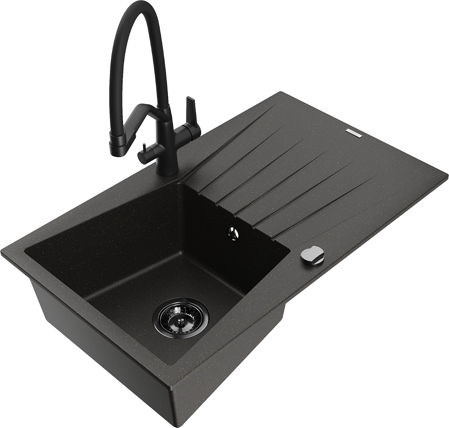 Mexen Cesar évier en granit 1 bac avec égouttoir et robinet de cuisine Duo, noir/or métallique - 6514-75-671701-70-B