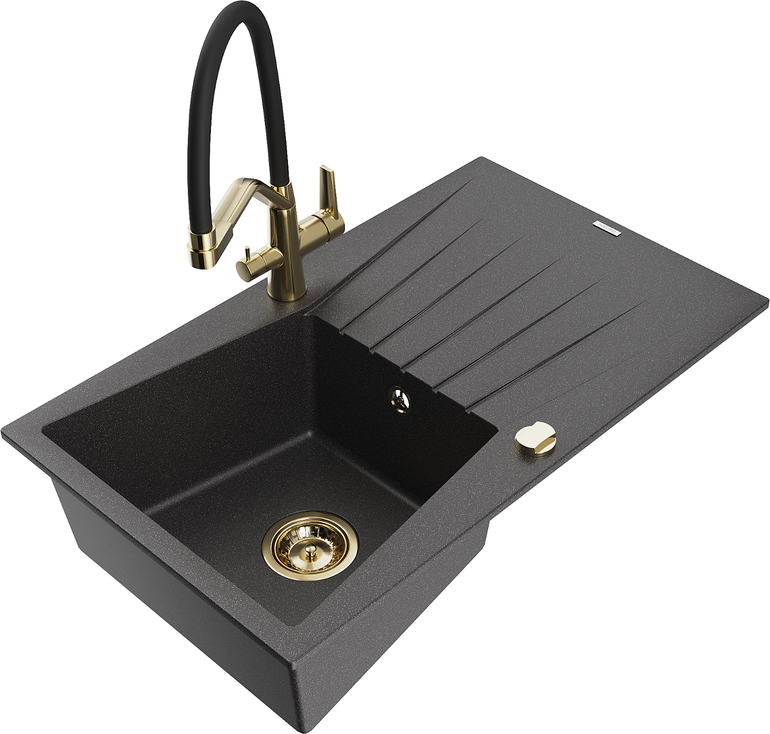 Mexen Cesar évier en granit à 1 bac avec égouttoir et robinet de cuisine Duo, noir moucheté - 6514-76-671701-57-G
