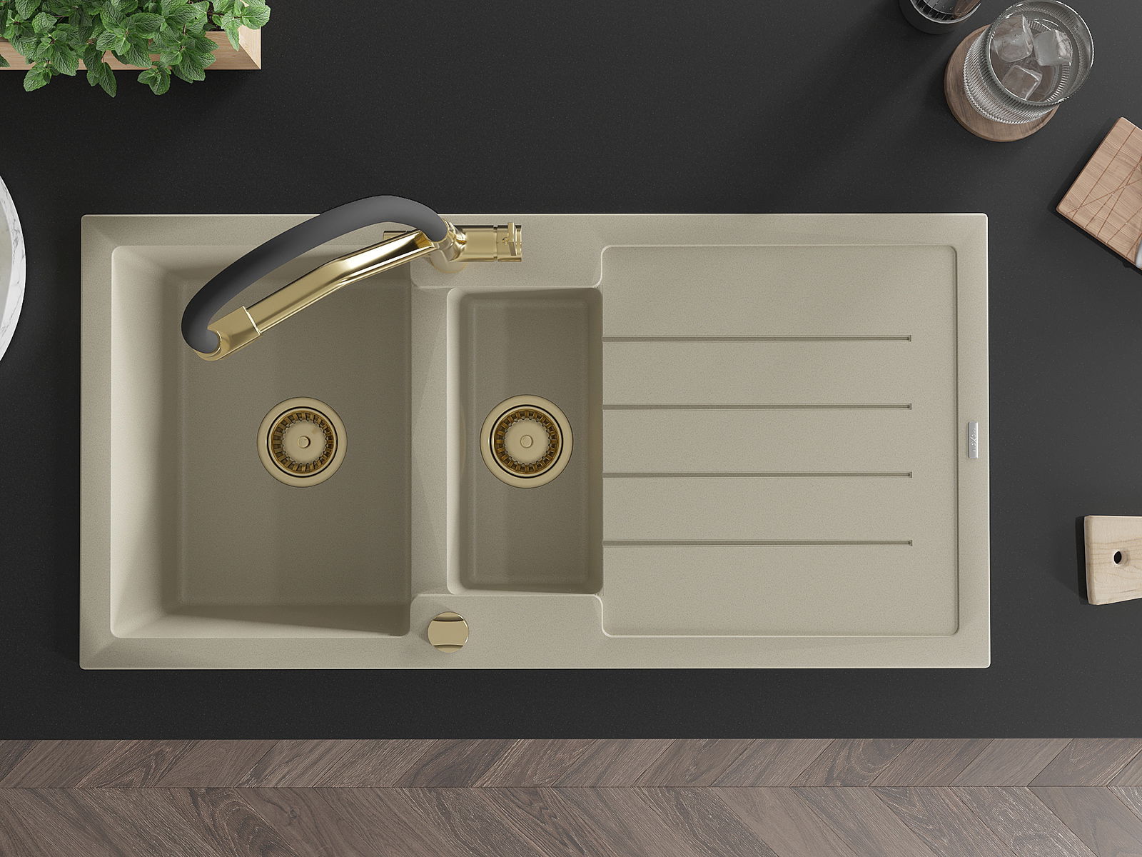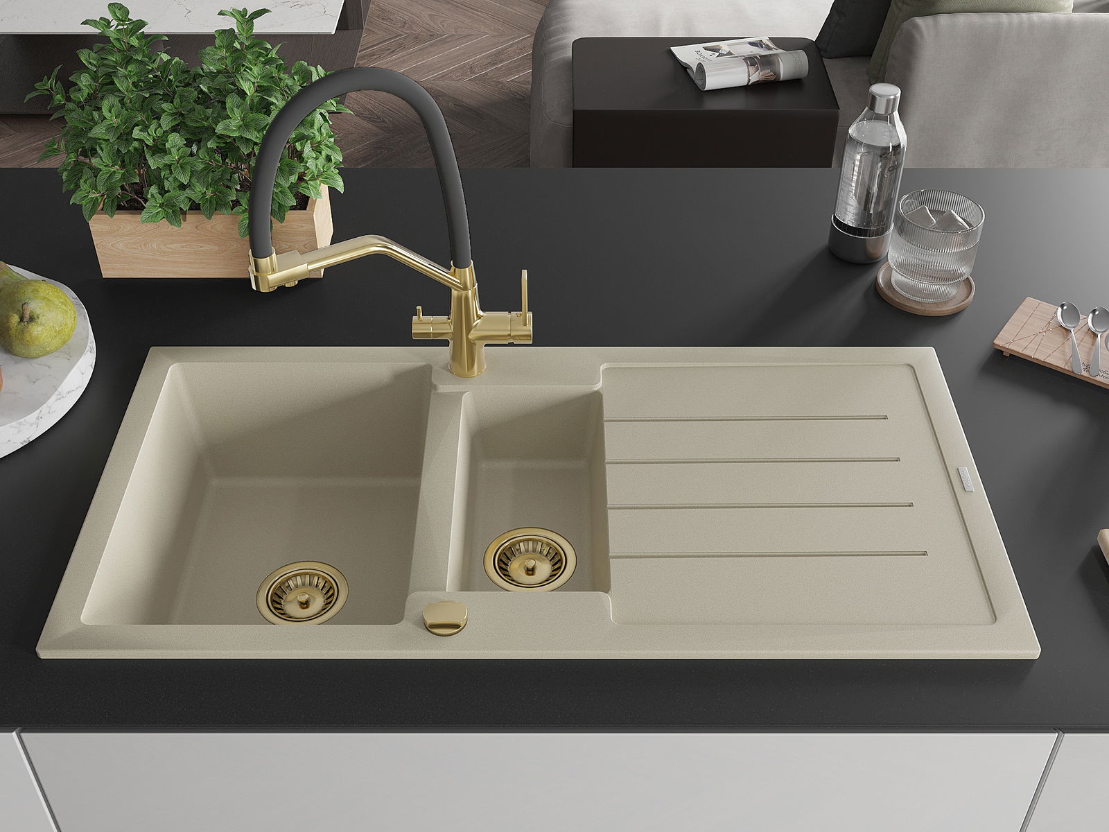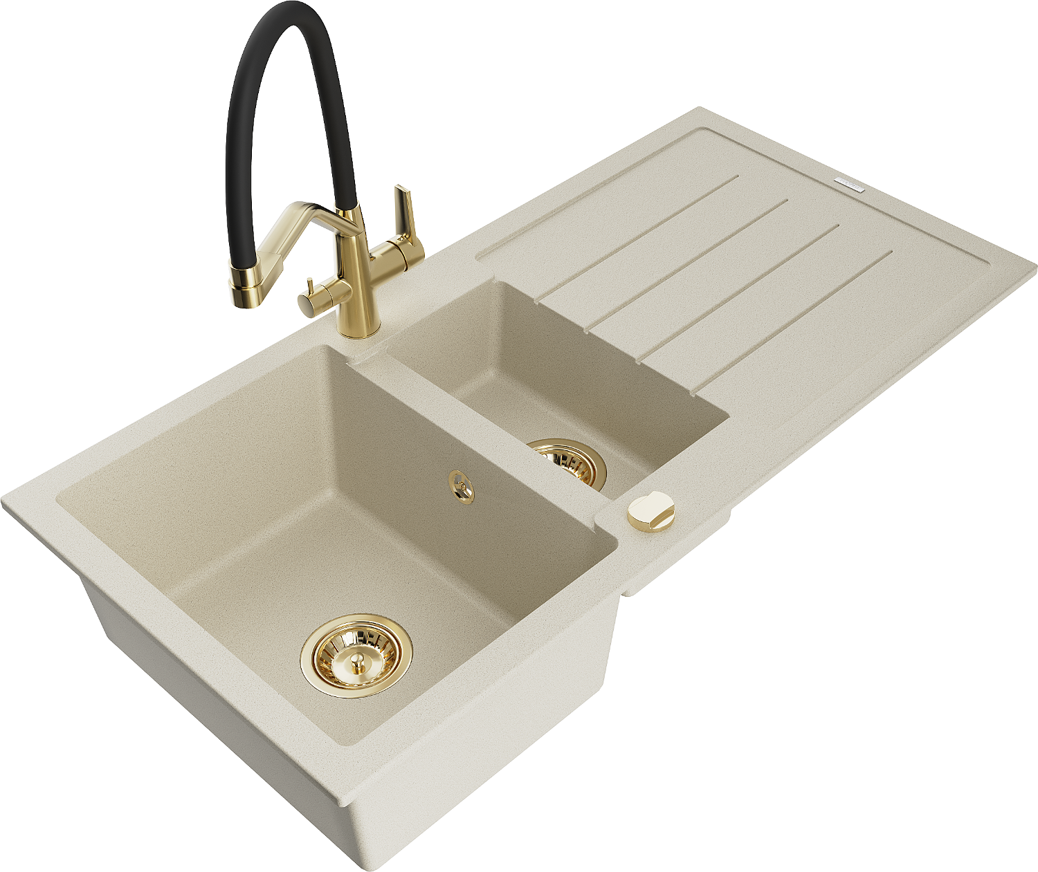 Mexen Andres évier en granit 1,5 cuves avec égouttoir et robinet de cuisine Duo, beige - 6515-69-671701-57-G