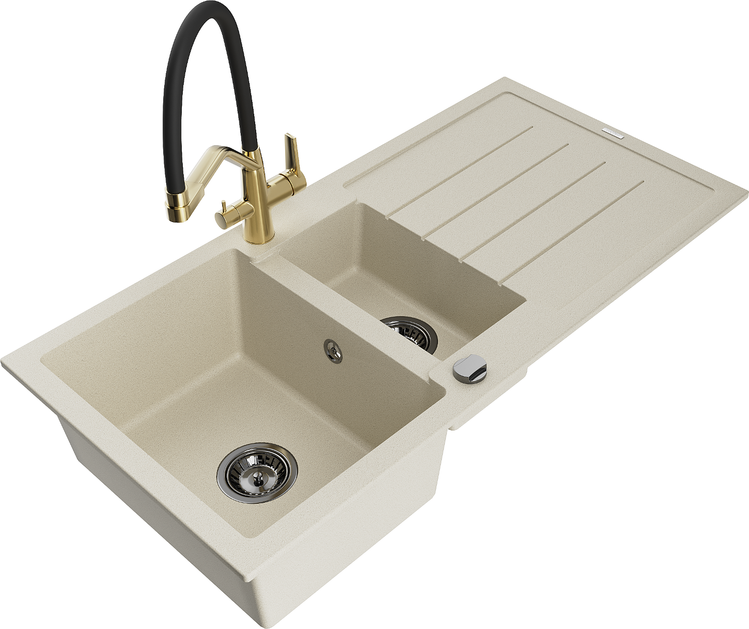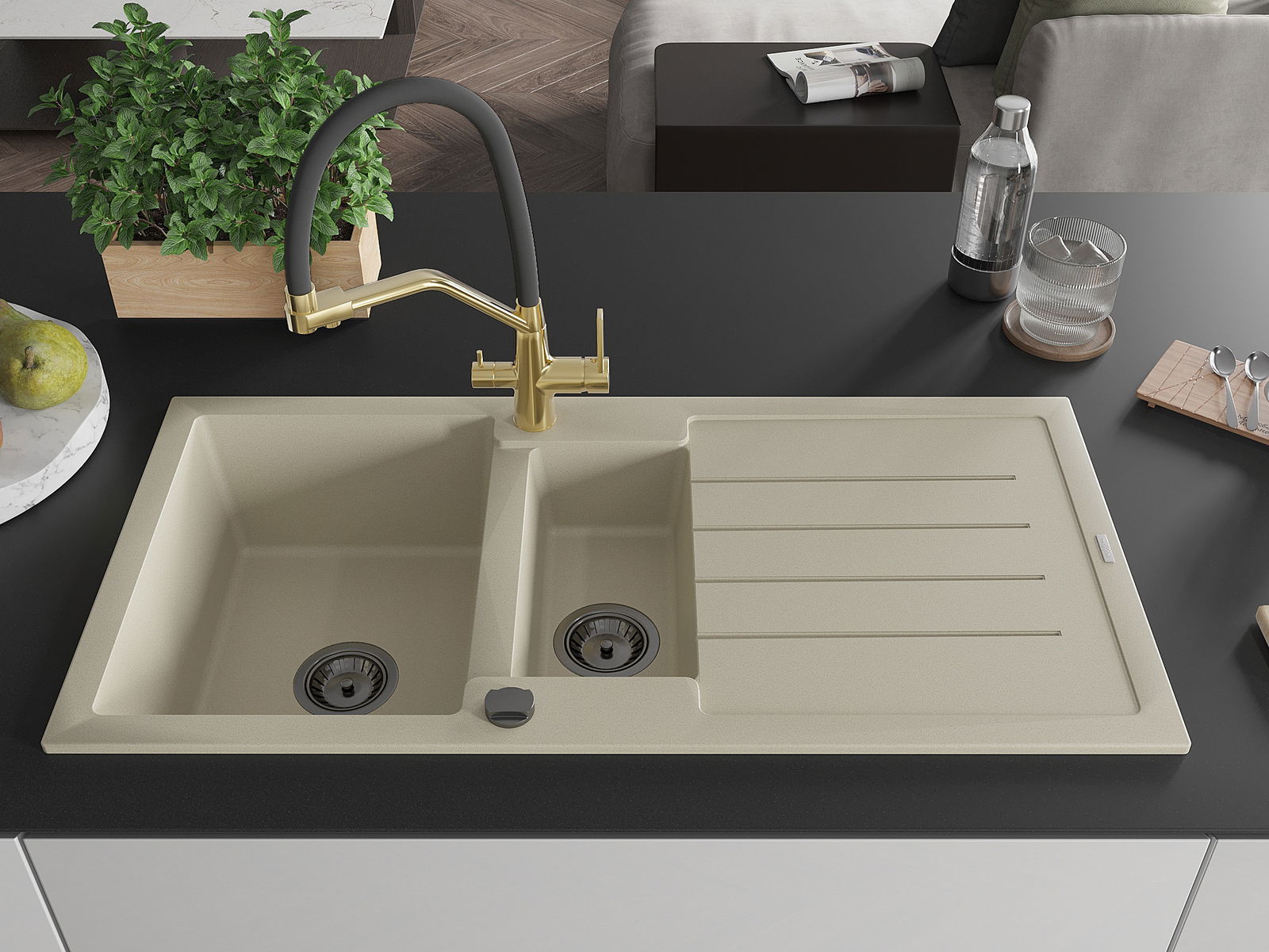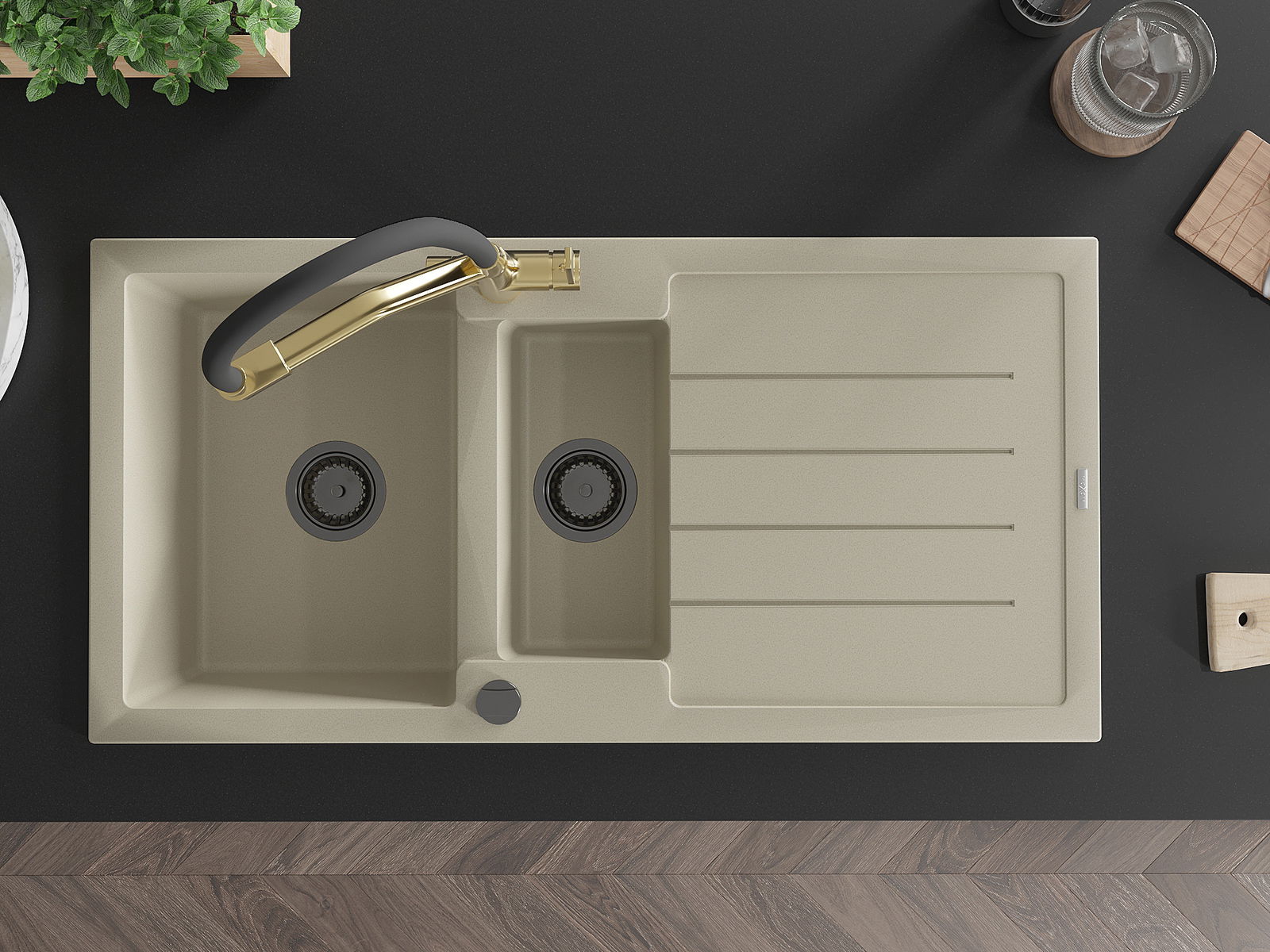 Mexen Andres évier en granit 1,5 bac avec égouttoir et mitigeur de cuisine Duo, beige - 6515-69-671701-57-B