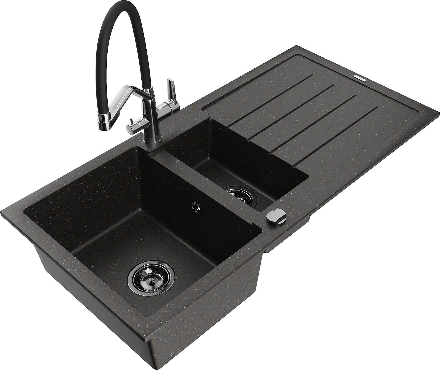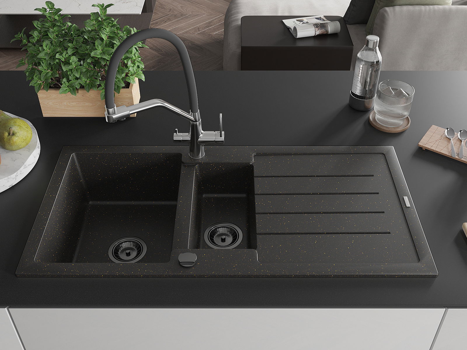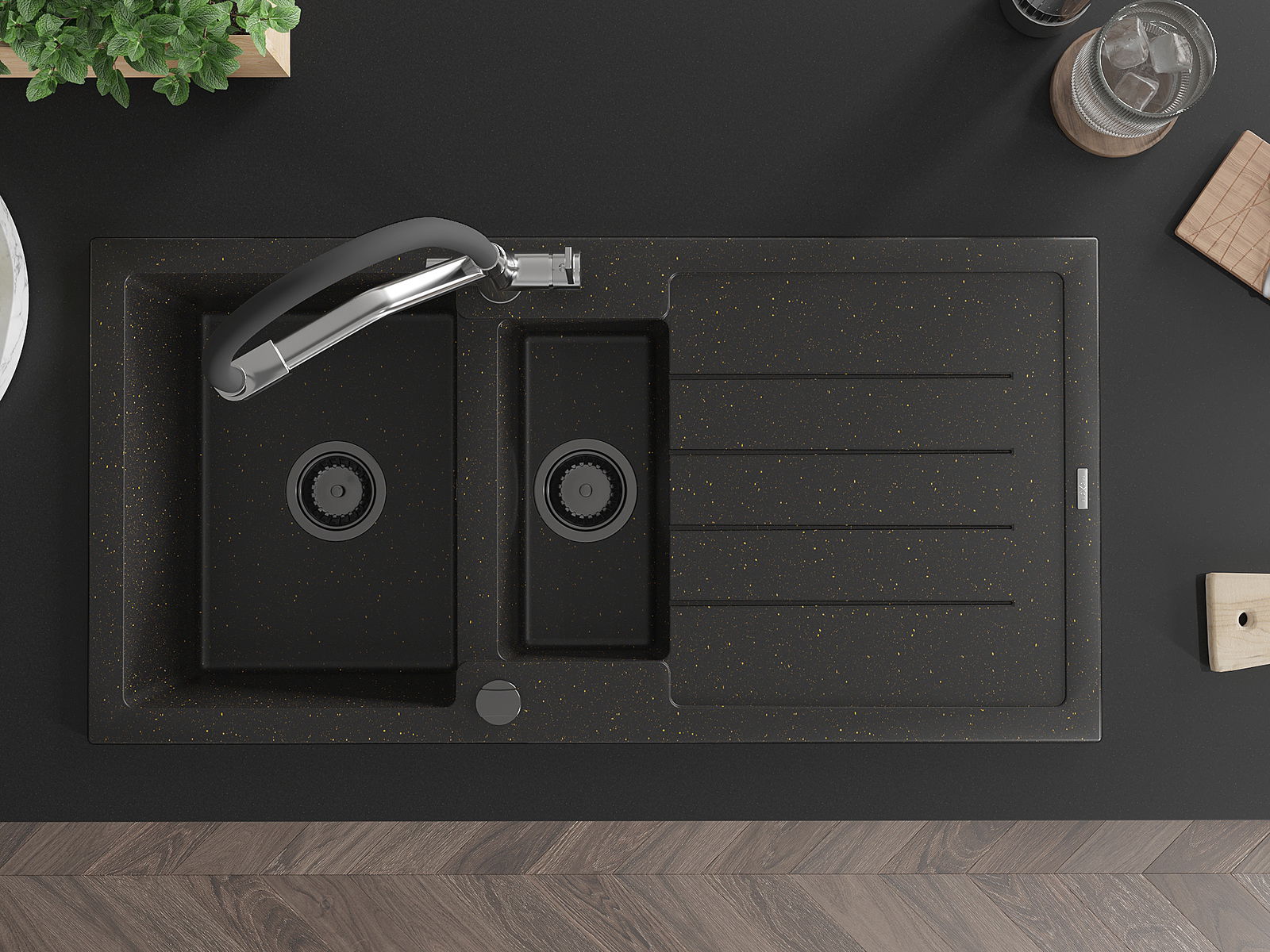 Mexen Andres évier granit 1,5 bac avec égouttoir et mitigeur cuisine Duo, noir/doré métallique - 6515-75-671701-07-B