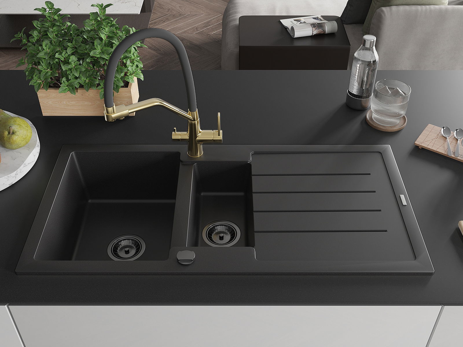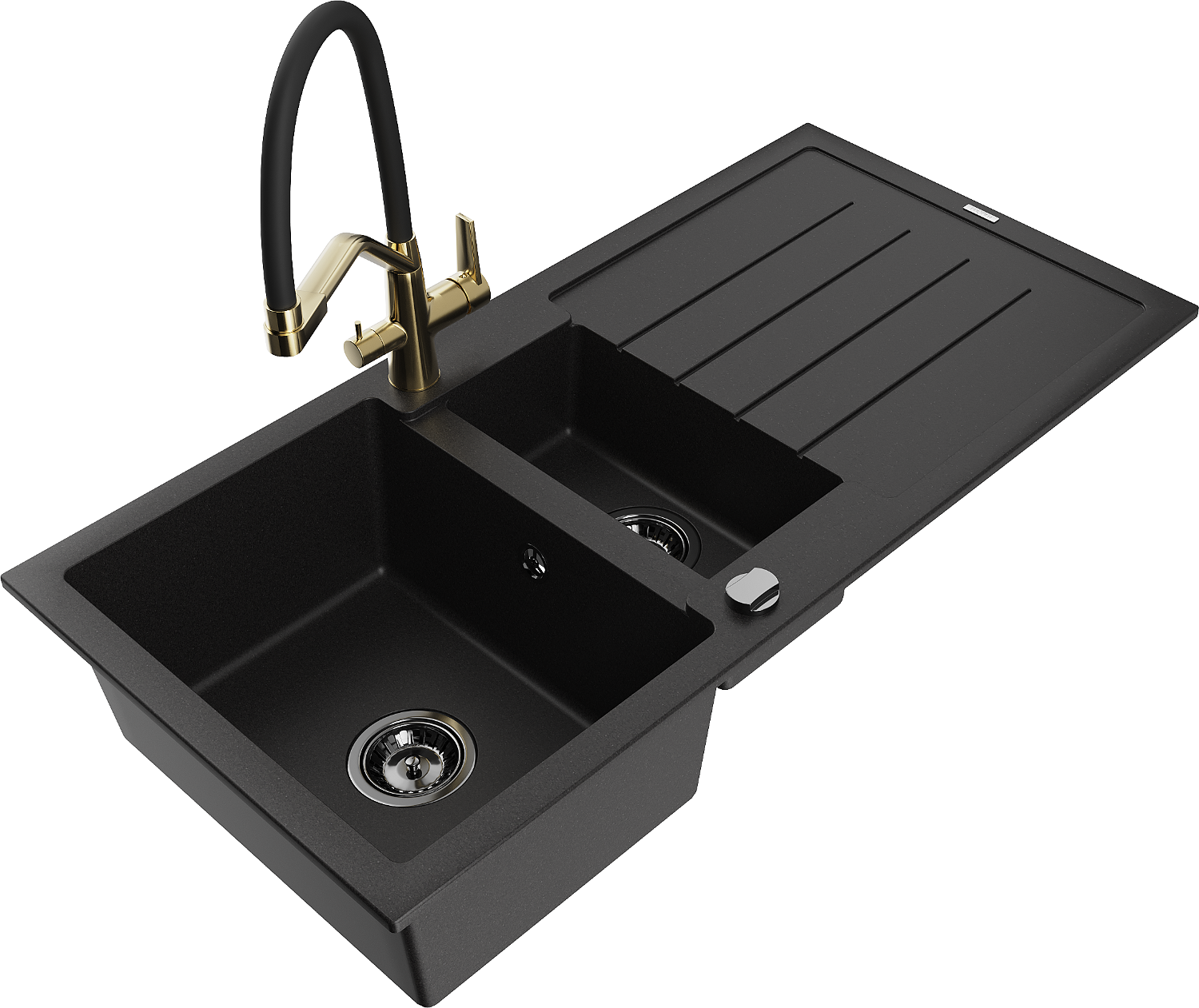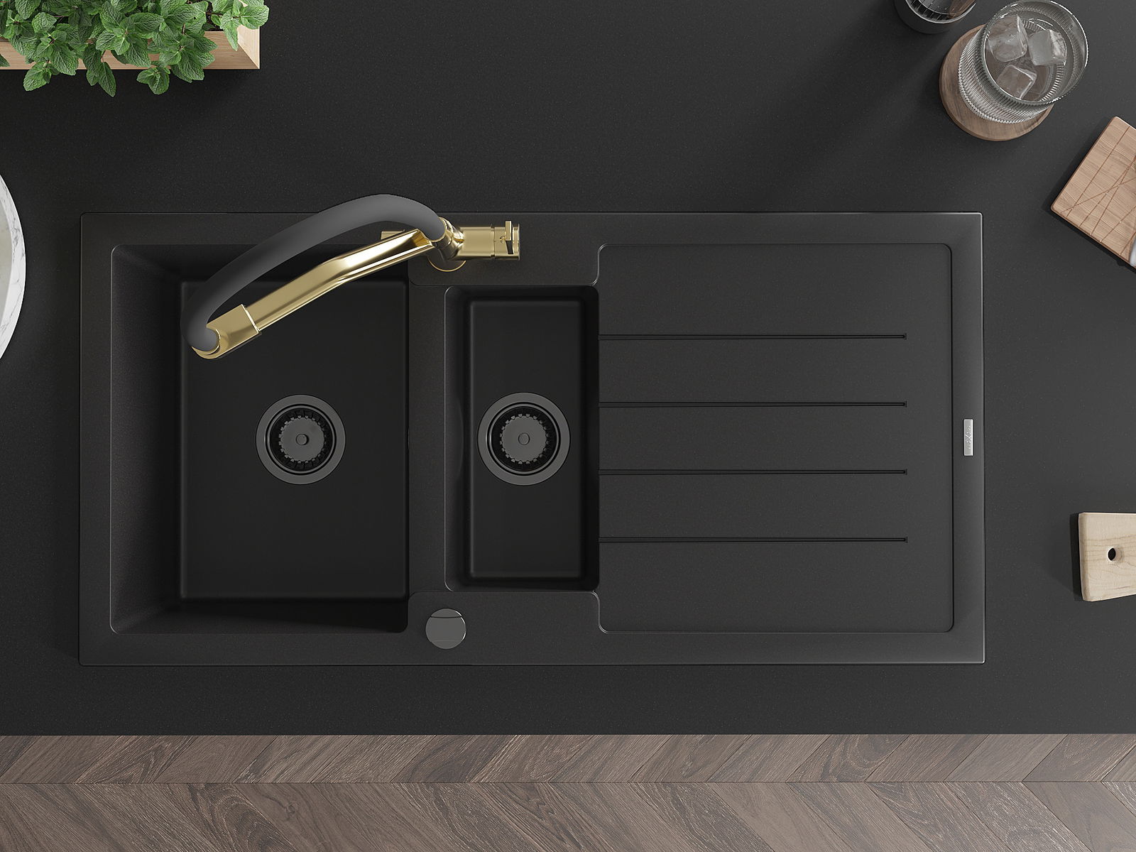 Mexen Andres évier en granit 1,5 bac avec égouttoir et robinet de cuisine Duo, noir - 6515-77-671701-57-B