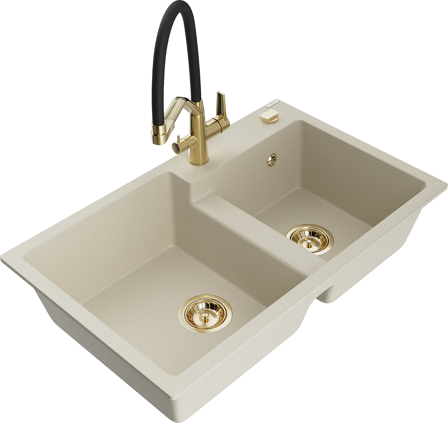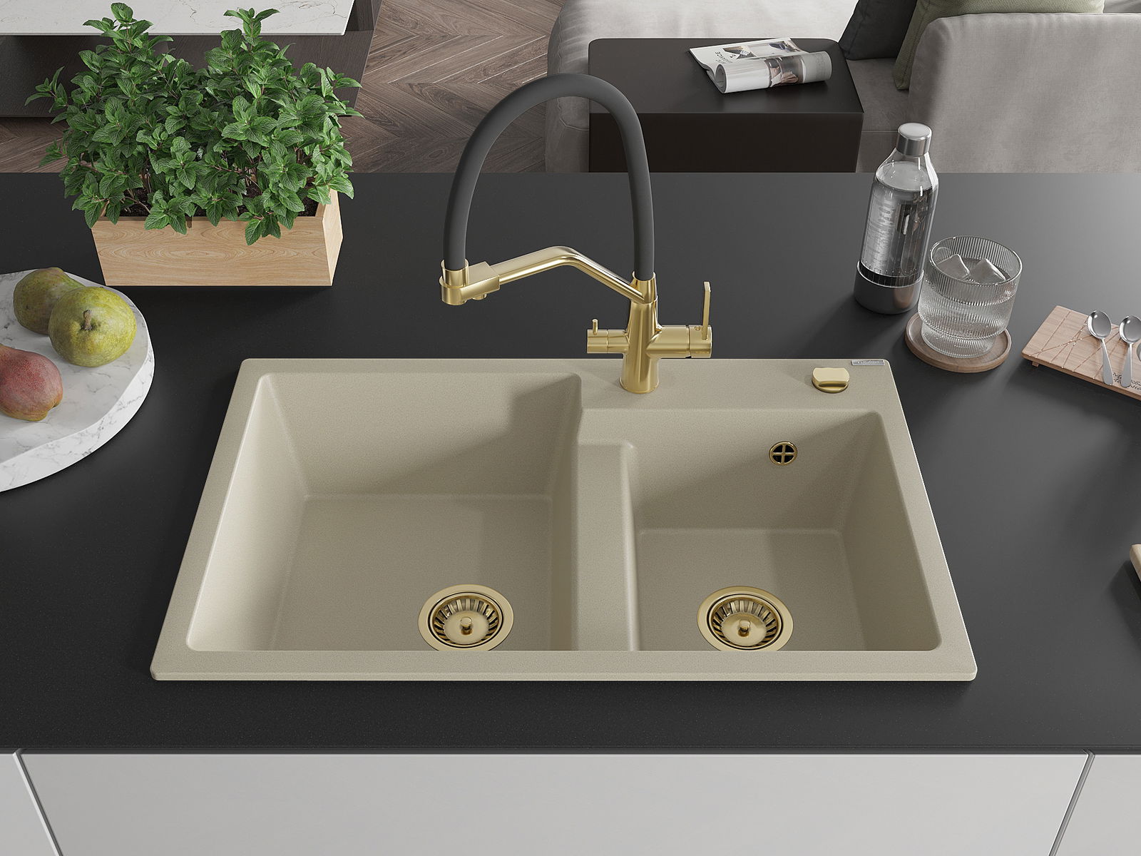Mexen Tomas évier en granit 2 bacs avec robinet de cuisine Duo, beige - 6516-69-671701-57-G