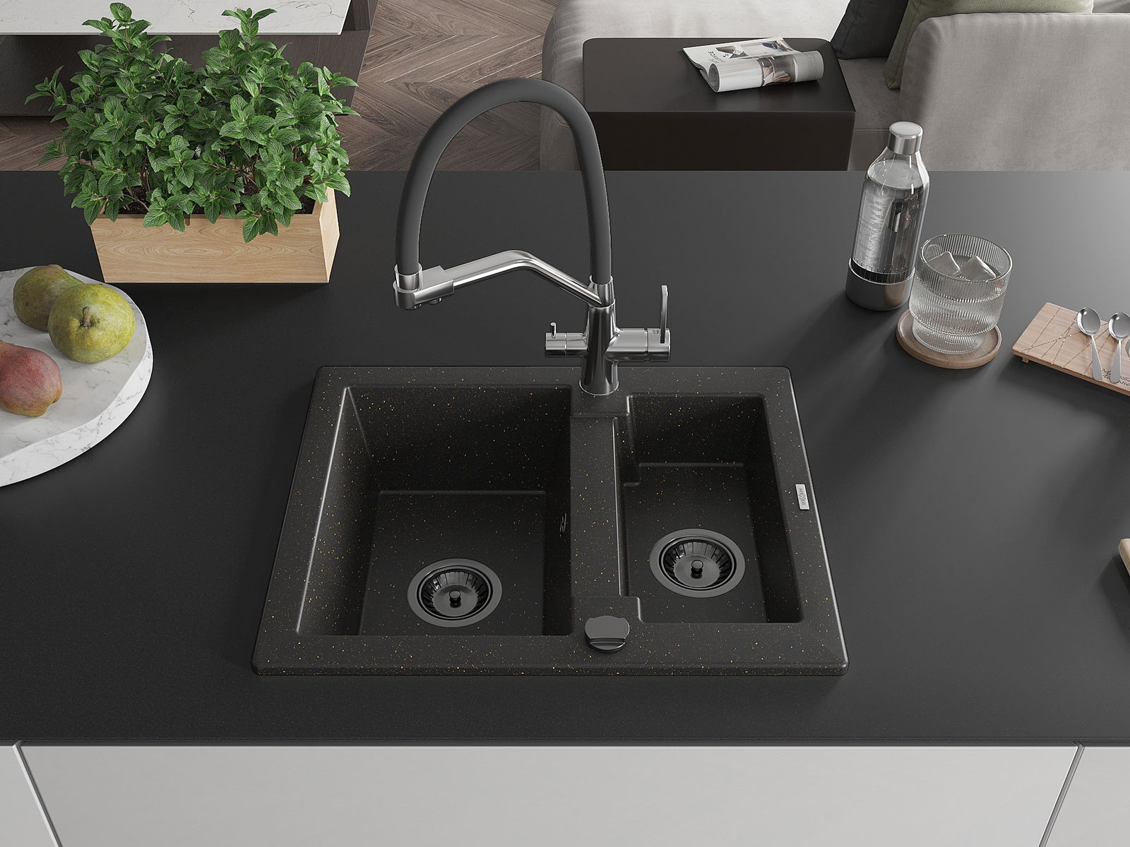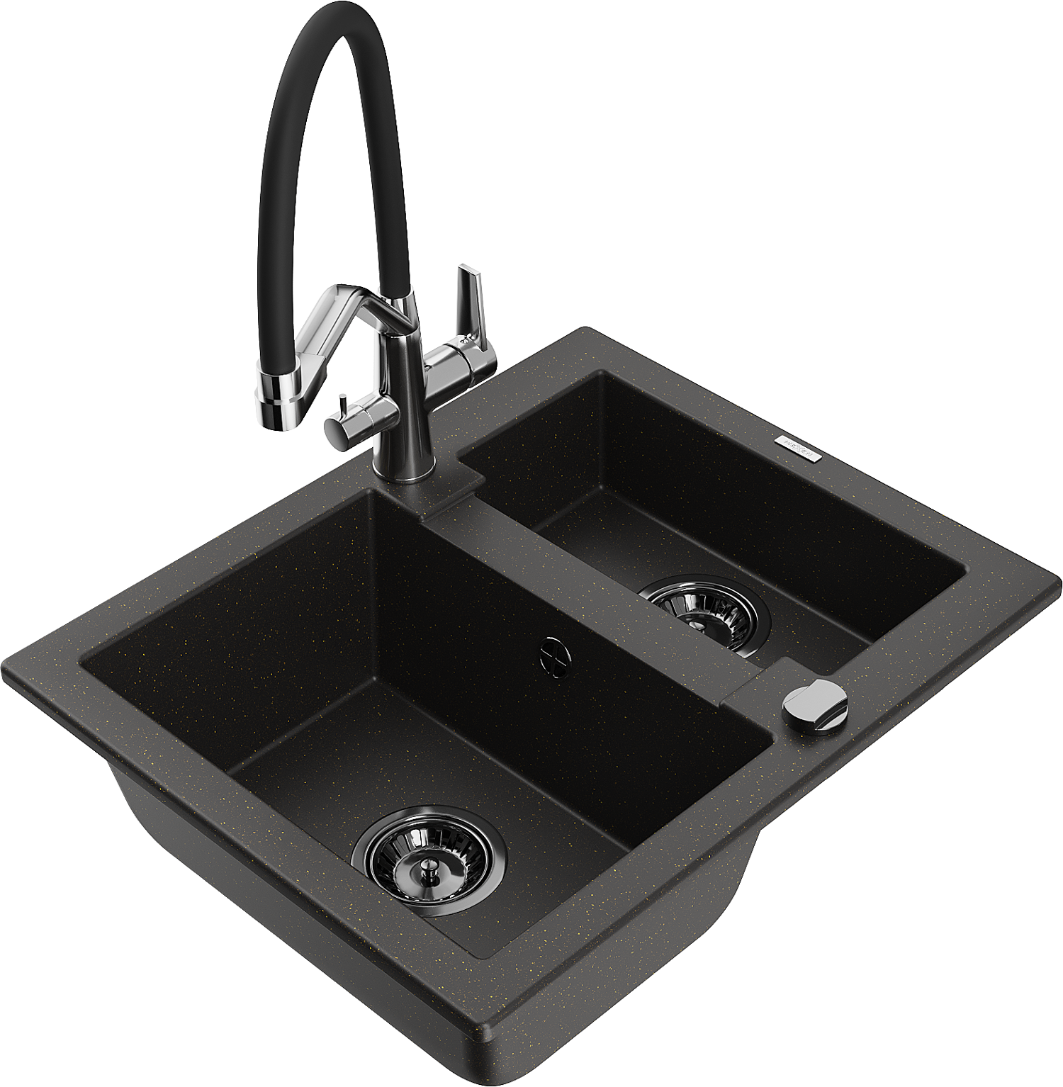 Mexen Carlos évier en granit 1,5 bac avec robinet de cuisine Duo, noir/or métallique - 6518-75-671701-07-B