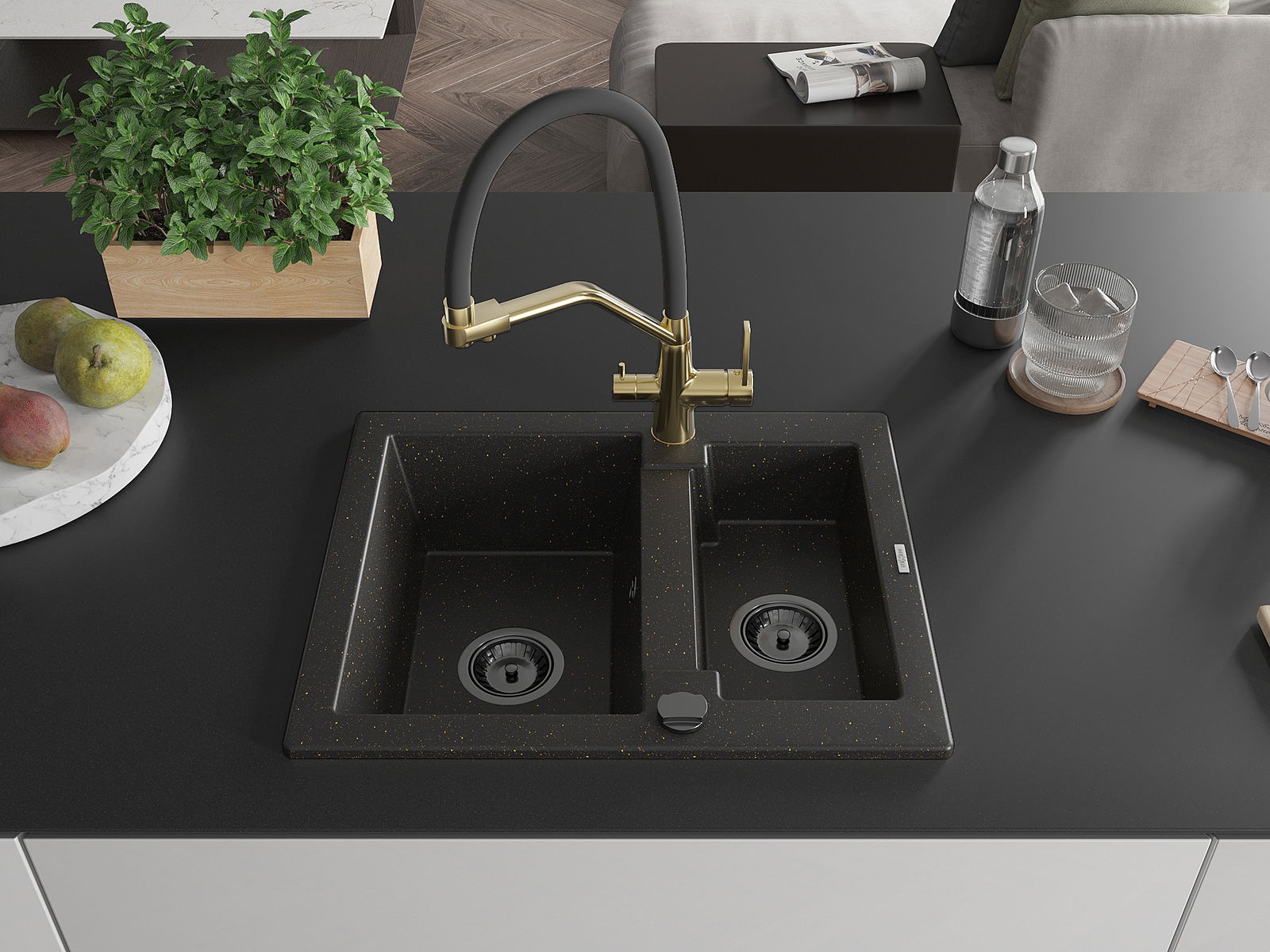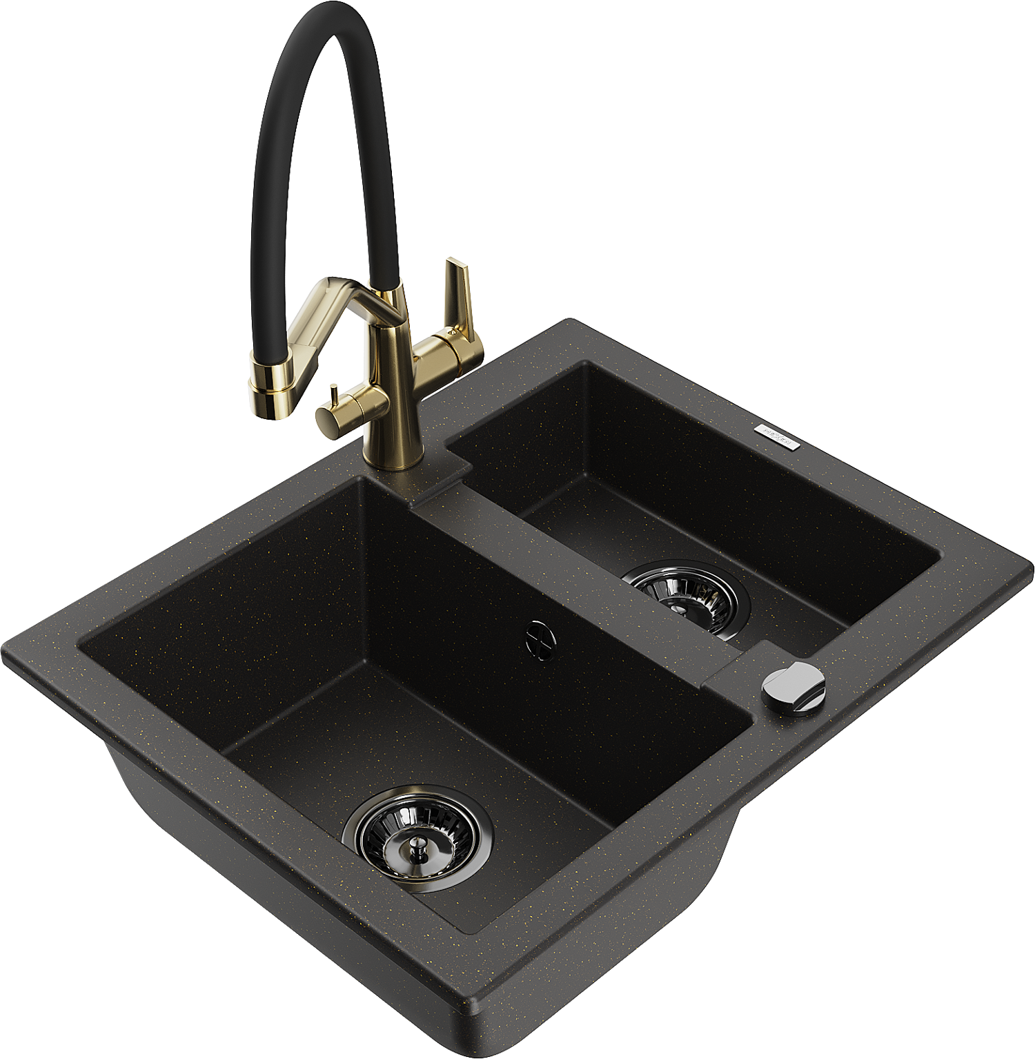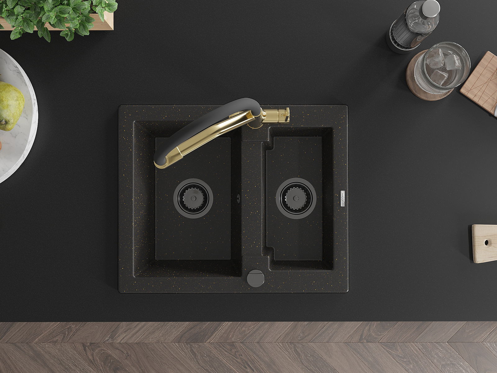 Mexen Carlos évier en granit 1,5 cuves avec robinet de cuisine Duo, noir/doré métallisé - 6518-75-671701-57-B