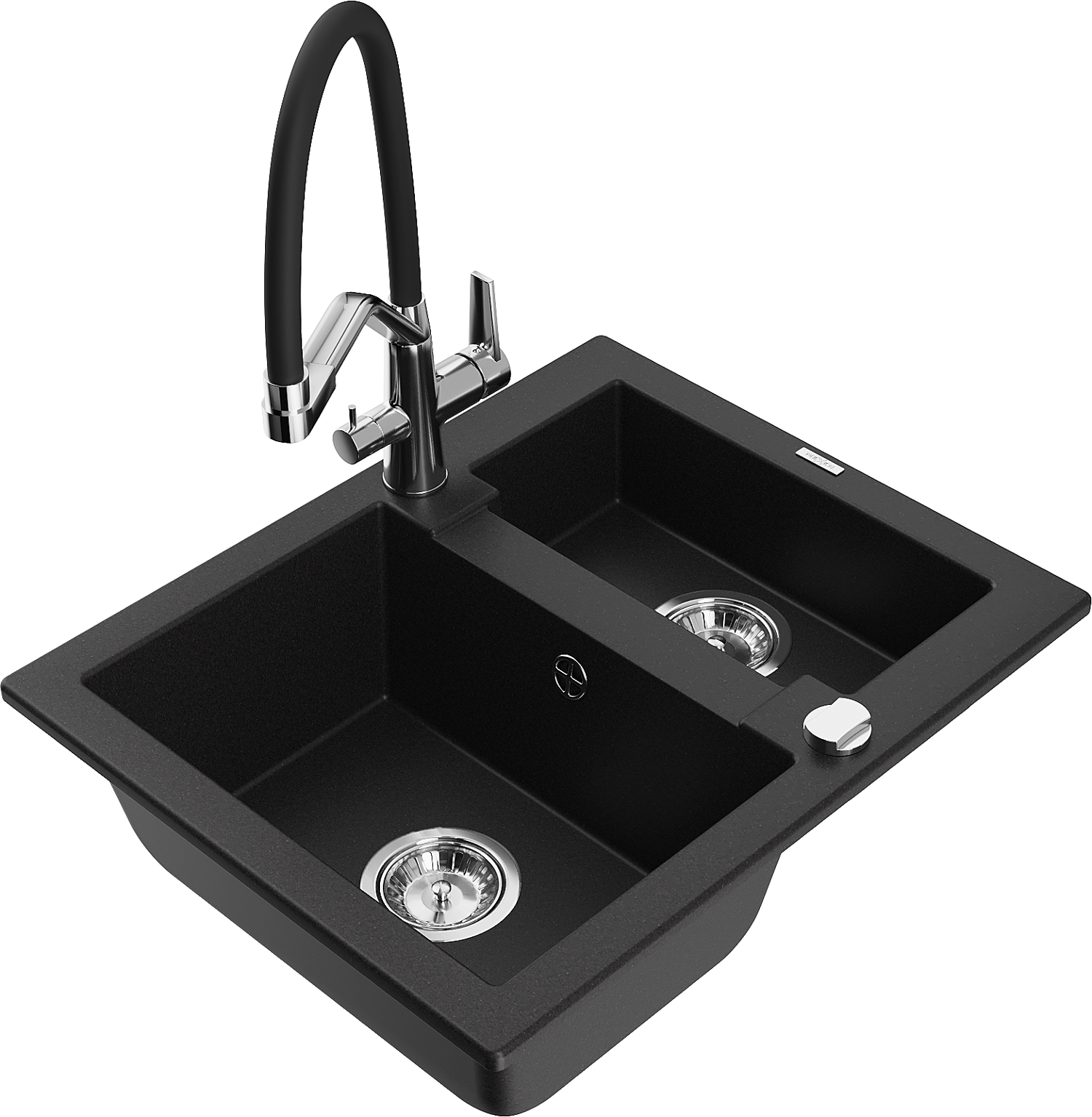Mexen Carlos évier en granit 1,5 cuves avec robinet de cuisine Duo, noir - 6518-77-671701-07