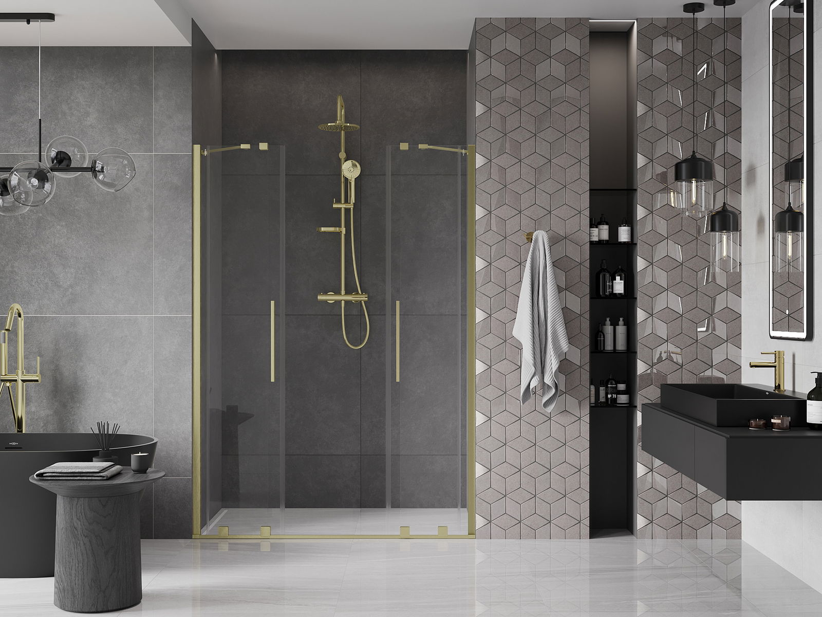 La poignée pratique et confortable est en acier inoxydable. Sa forme élégante, associée à une finition assortie à la couleur des profilés, confère à l'ensemble un style moderne et élégant, soulignant l'esthétique de chaque salle de bains.