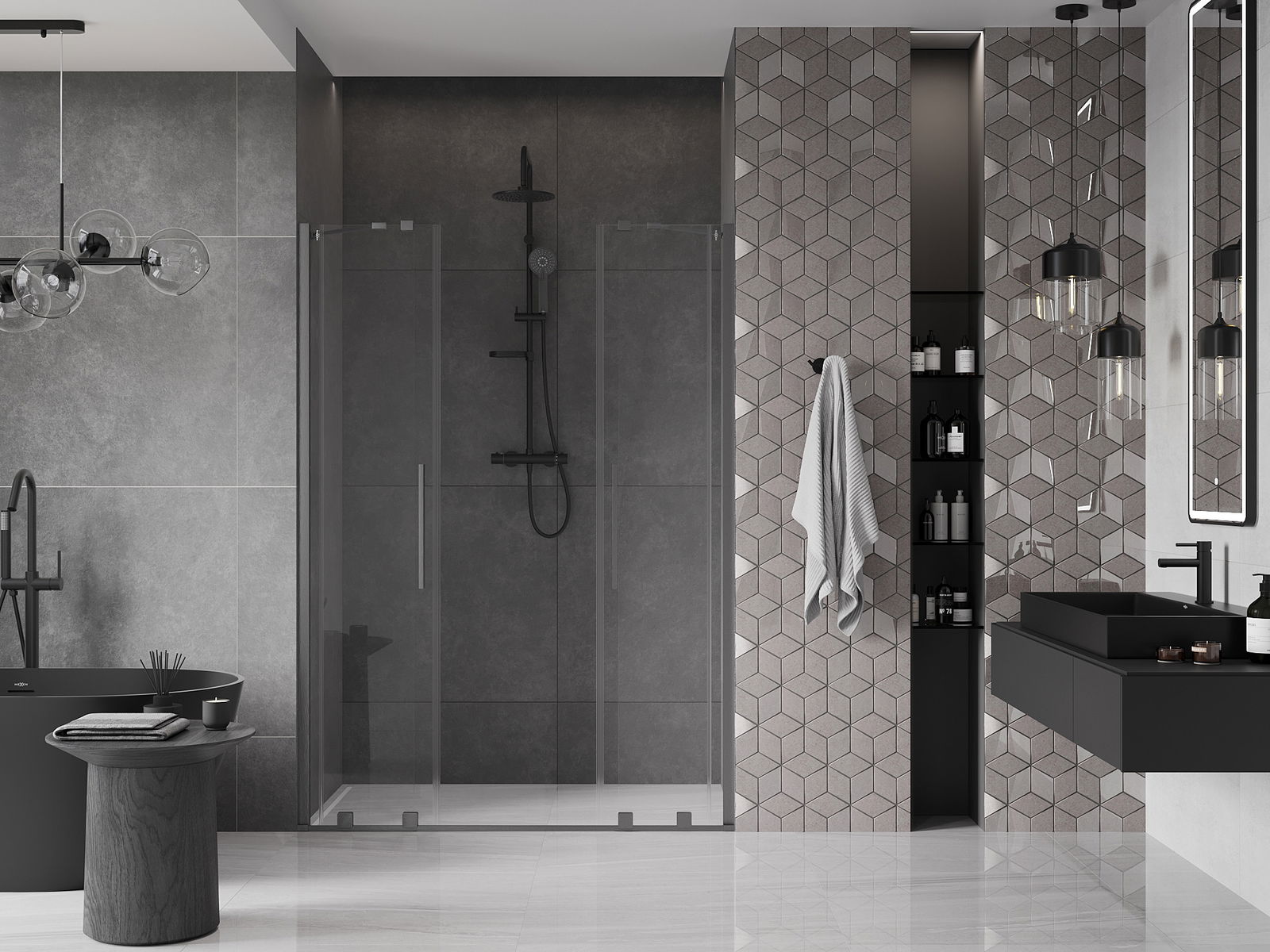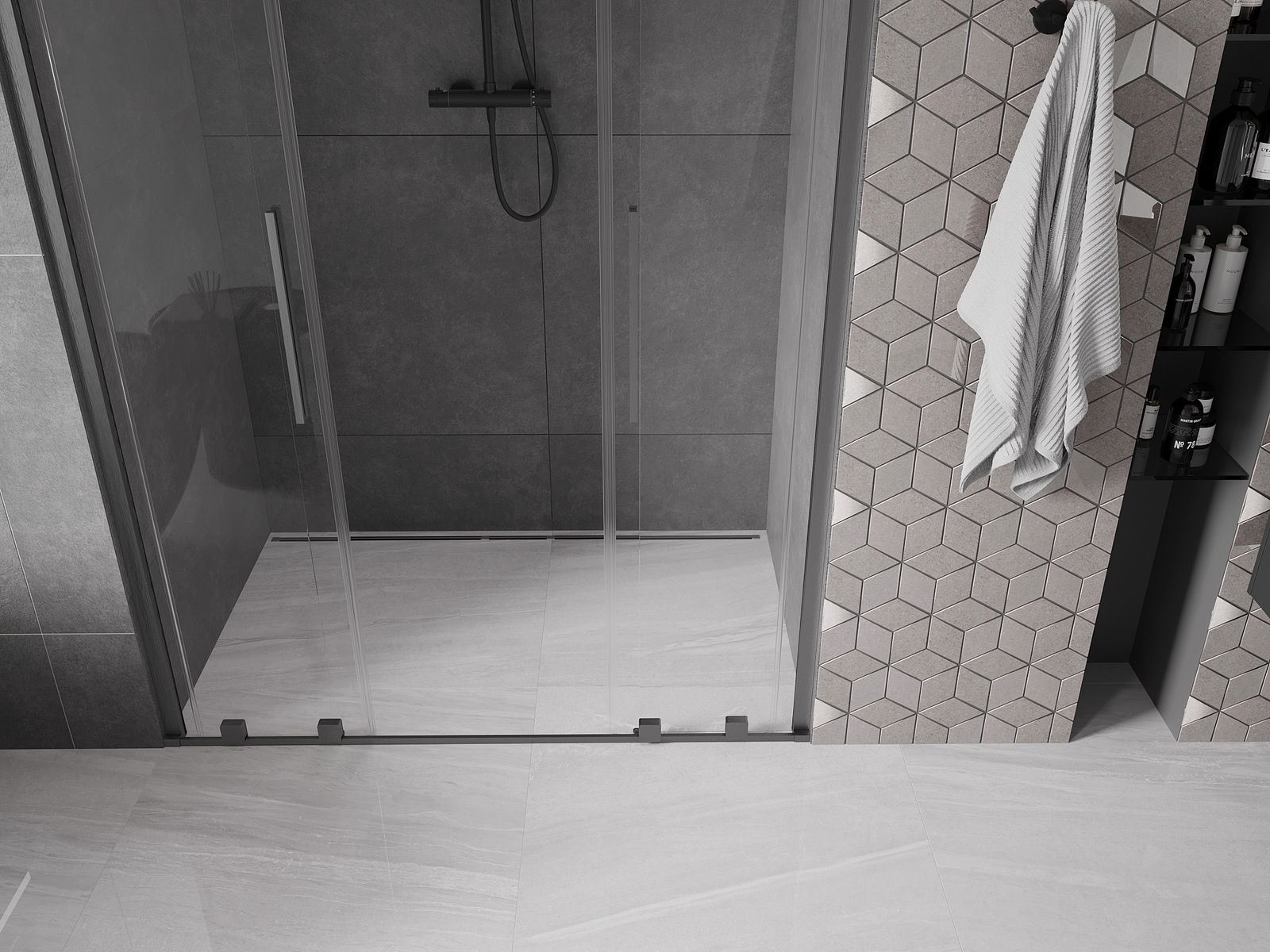 La poignée pratique et confortable est en acier inoxydable. Sa forme élégante, associée à une finition assortie à la couleur des profilés, confère à l'ensemble un style moderne et élégant, soulignant l'esthétique de chaque salle de bains.