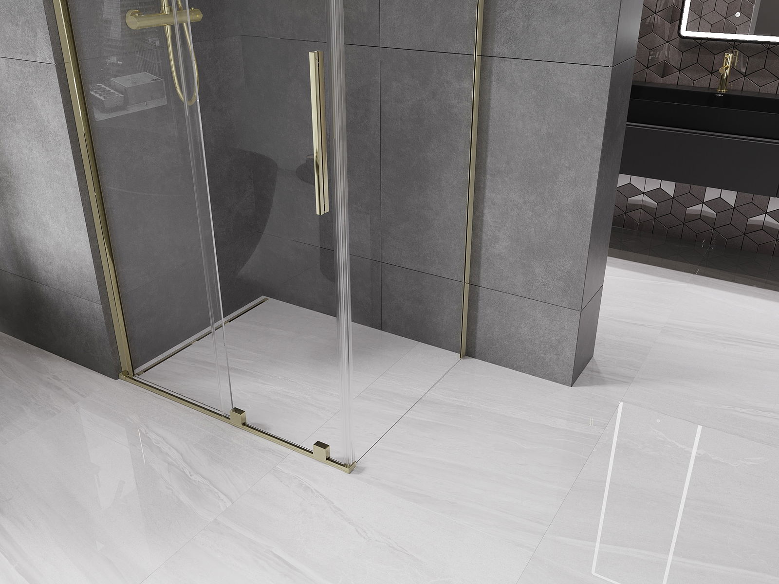 Poignée pratique et confortable en acier inoxydable. La forme moderne associée à une finition assortie à la couleur des profilés confère à l'ensemble un aspect moderne et élégant, soulignant l'esthétique de chaque salle de bain.