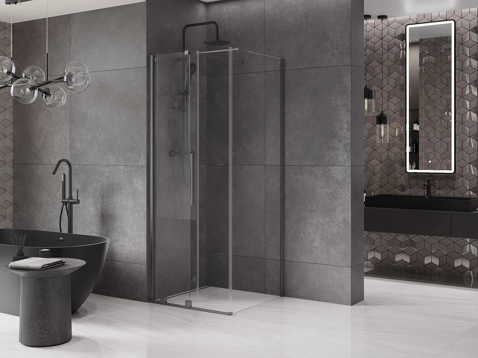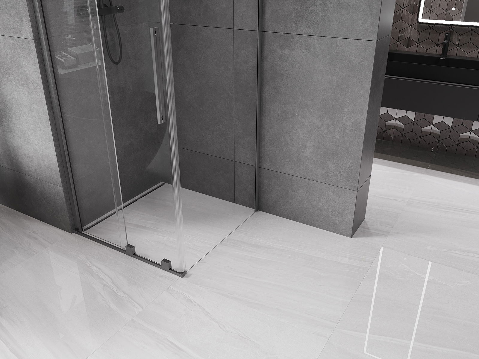 Poignée pratique et confortable en acier inoxydable. La forme moderne associée à une finition assortie à la couleur des profilés confère à l'ensemble un aspect moderne et élégant, soulignant l'esthétique de chaque salle de bain.