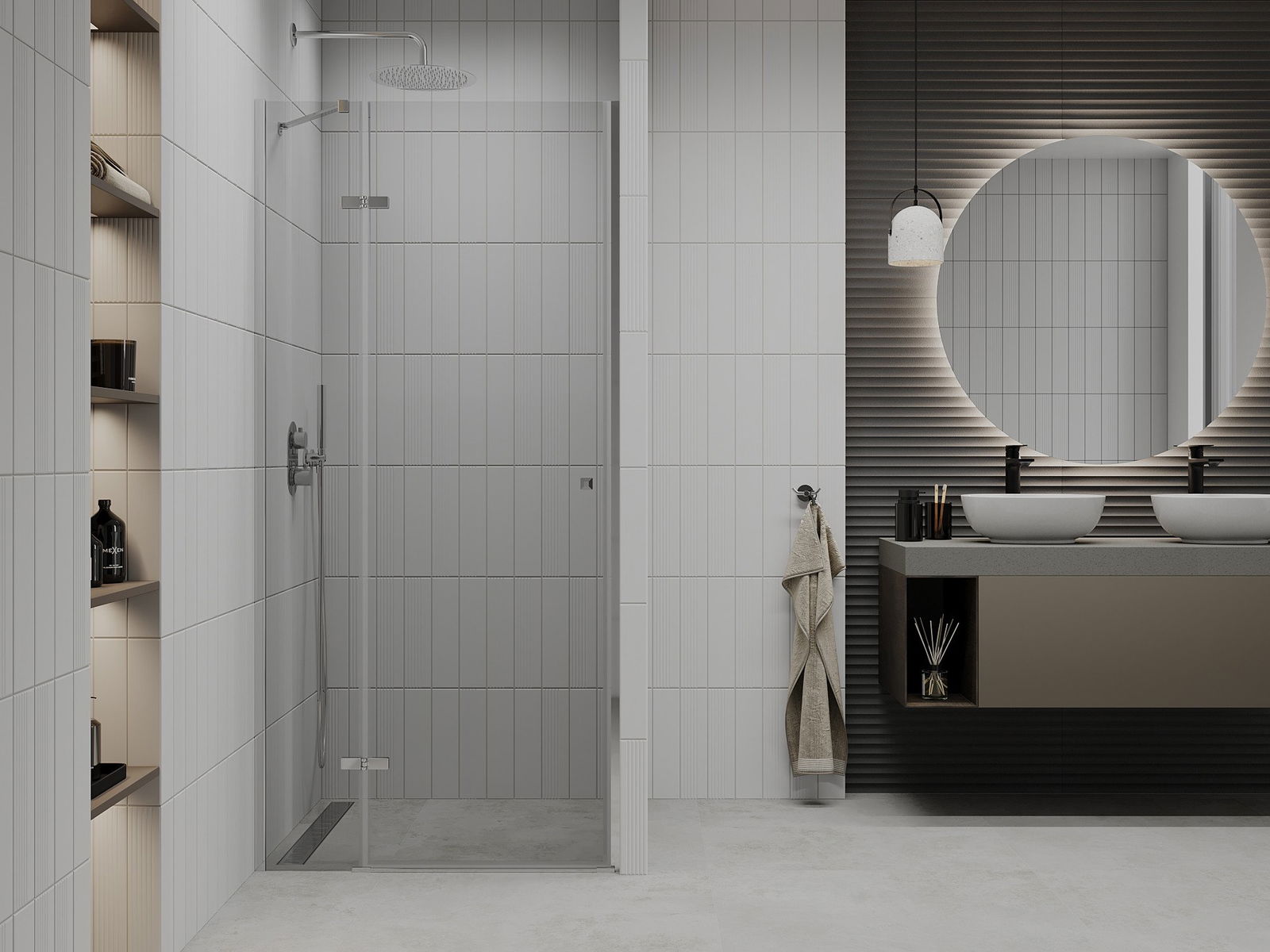 La poignée pratique et confortable est fabriquée en métal durable et résistant. Sa forme élégante, associée à une finition assortie à la couleur des profilés, confère à l'ensemble un style moderne et élégant, soulignant l'esthétique de chaque salle de bains.