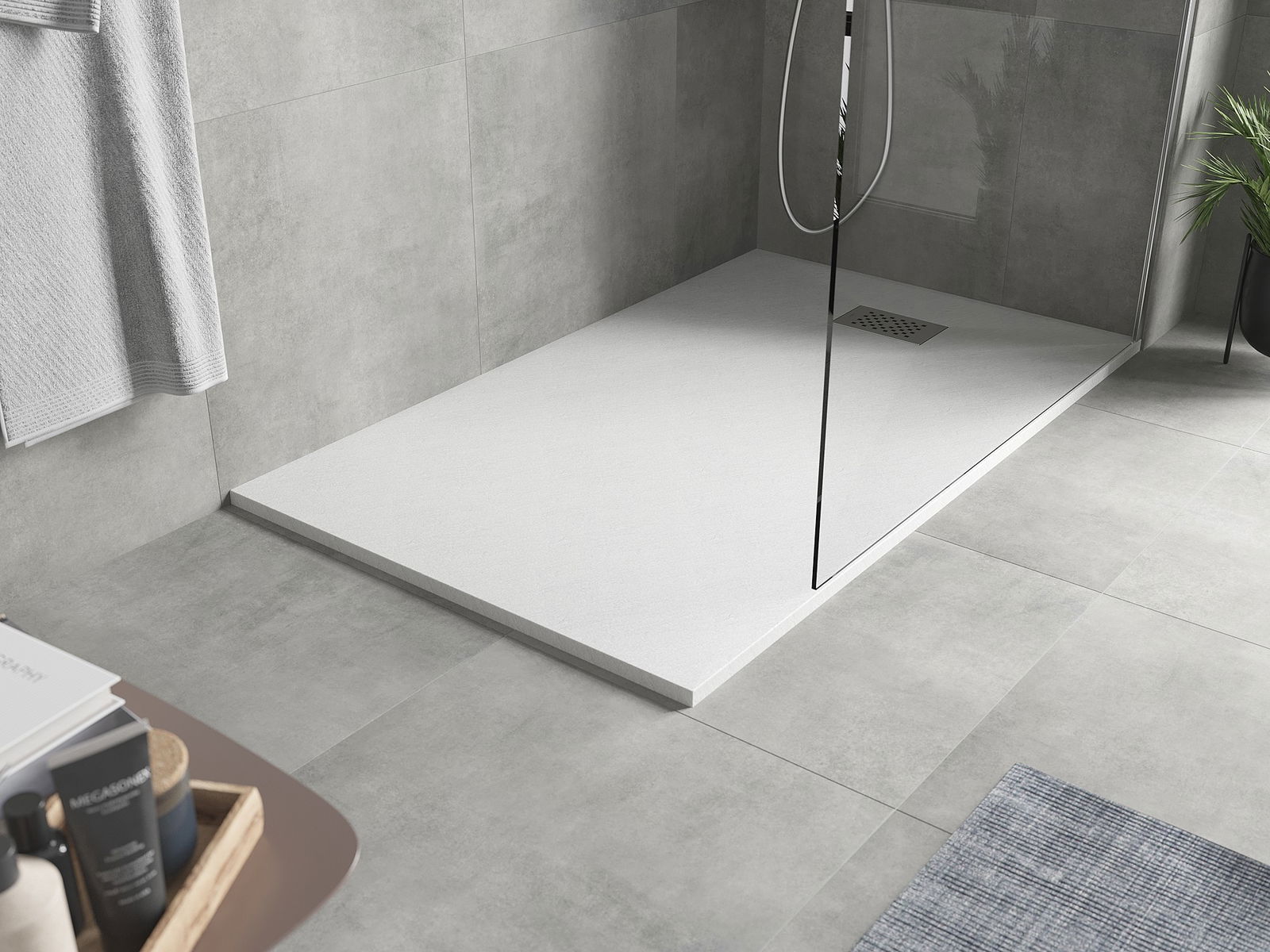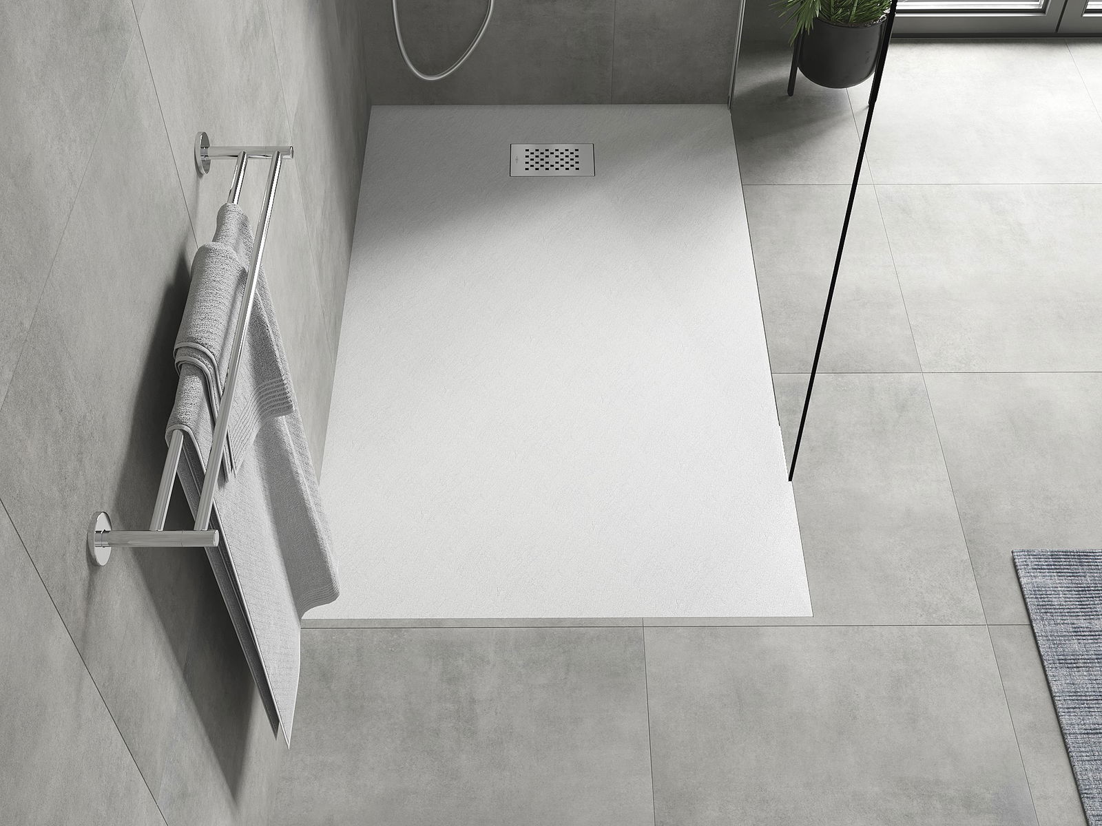 La surface du receveur de douche rappelle par sa structure la pierre. Elle constitue une combinaison exceptionnelle d'un aspect naturel et d'un aménagement intérieur moderne. Elle ajoute du caractère, souligne l'esthétique et l'élégance de la décoration de la salle de bains et séduit par sa forme.