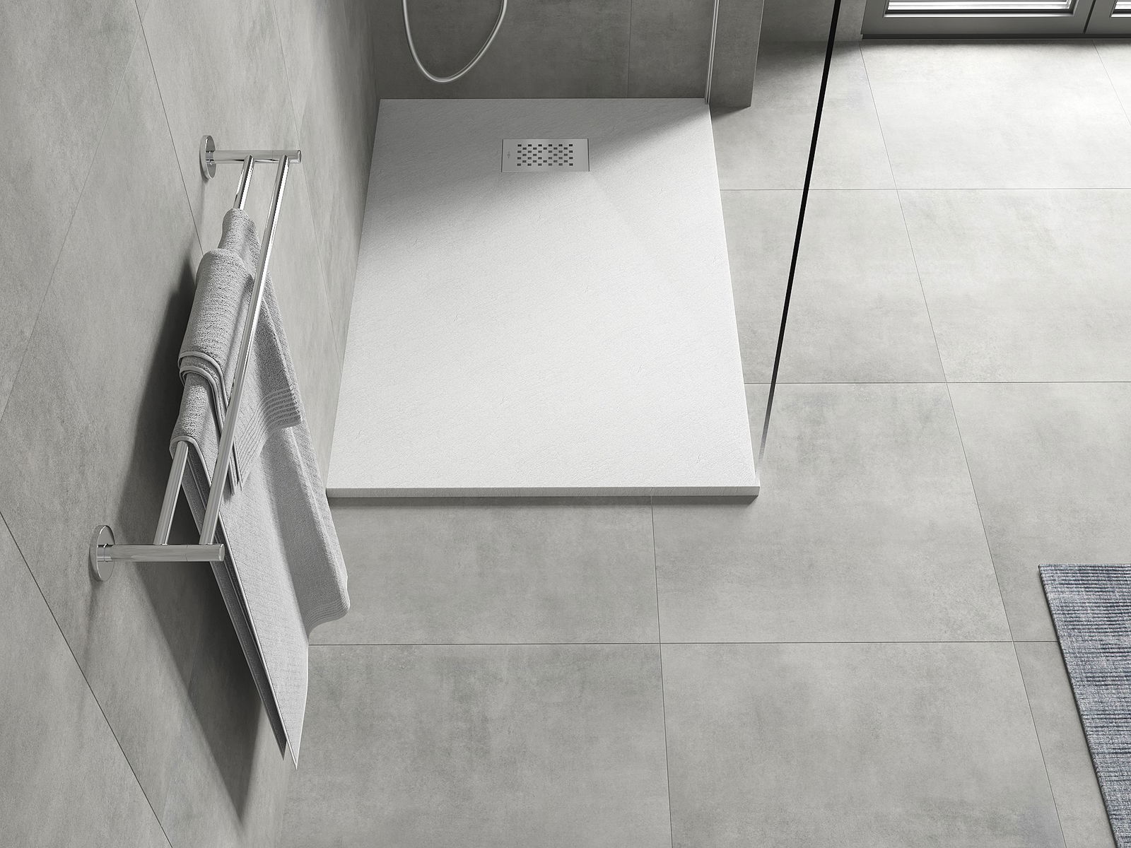 La surface du receveur de douche évoque la pierre. C'est une combinaison unique d'aspect naturel et de design intérieur moderne. Il ajoute du caractère, souligne l'esthétique et l'élégance de la salle de bains et séduit par sa forme.