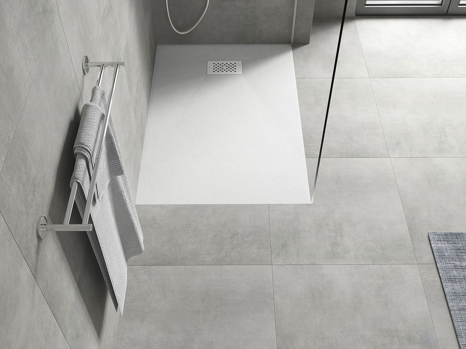 La surface du receveur de douche évoque la pierre. C'est une combinaison unique d'aspect naturel et de design intérieur moderne. Il ajoute du caractère, souligne l'esthétique et l'élégance de la salle de bains et séduit par sa forme.