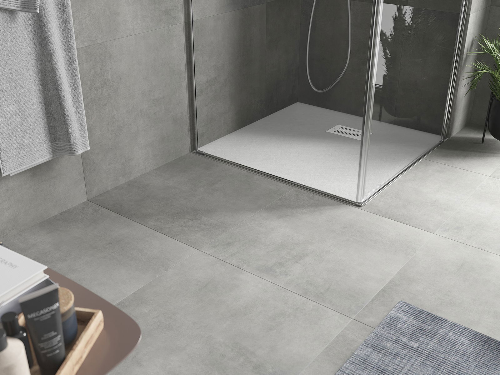 La surface du receveur de douche évoque la pierre. C'est une combinaison unique d'aspect naturel et de design intérieur moderne. Il ajoute du caractère, souligne l'esthétique et l'élégance de la salle de bains et séduit par sa forme.