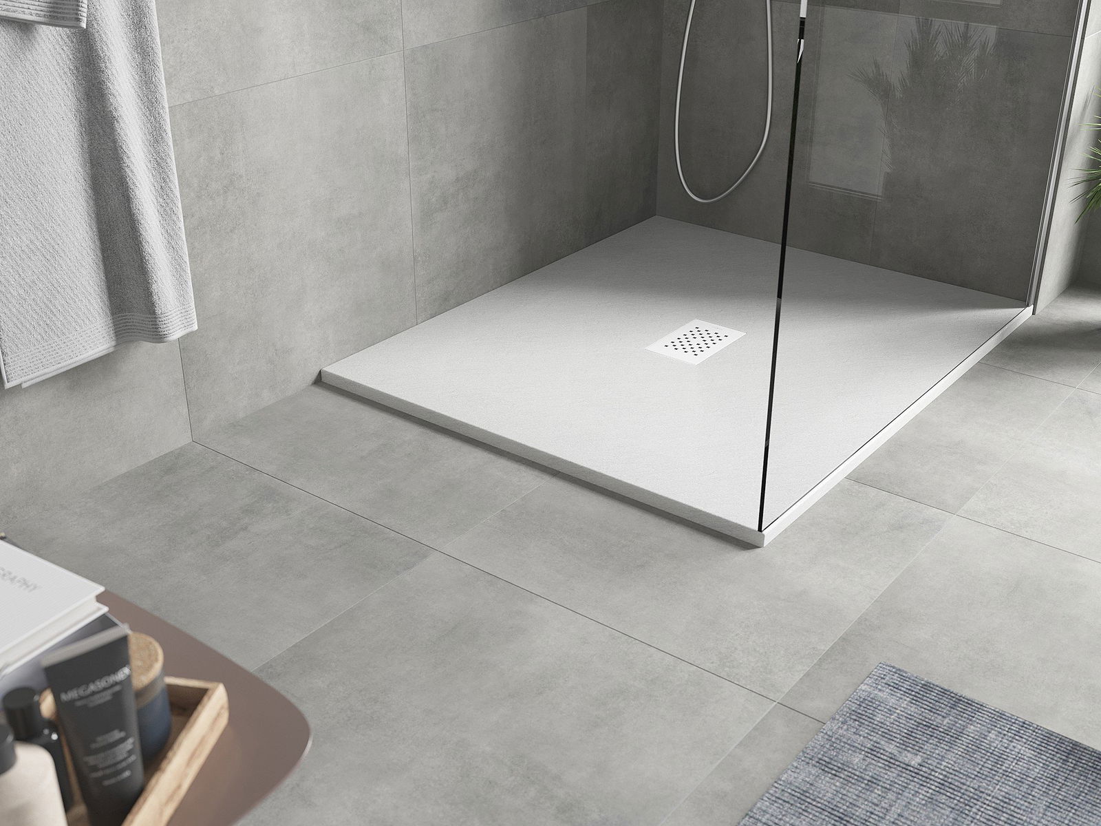 La surface du receveur de douche évoque la pierre. C'est une combinaison unique d'aspect naturel et de design intérieur moderne. Il ajoute du caractère, souligne l'esthétique et l'élégance de la salle de bains et séduit par sa forme.