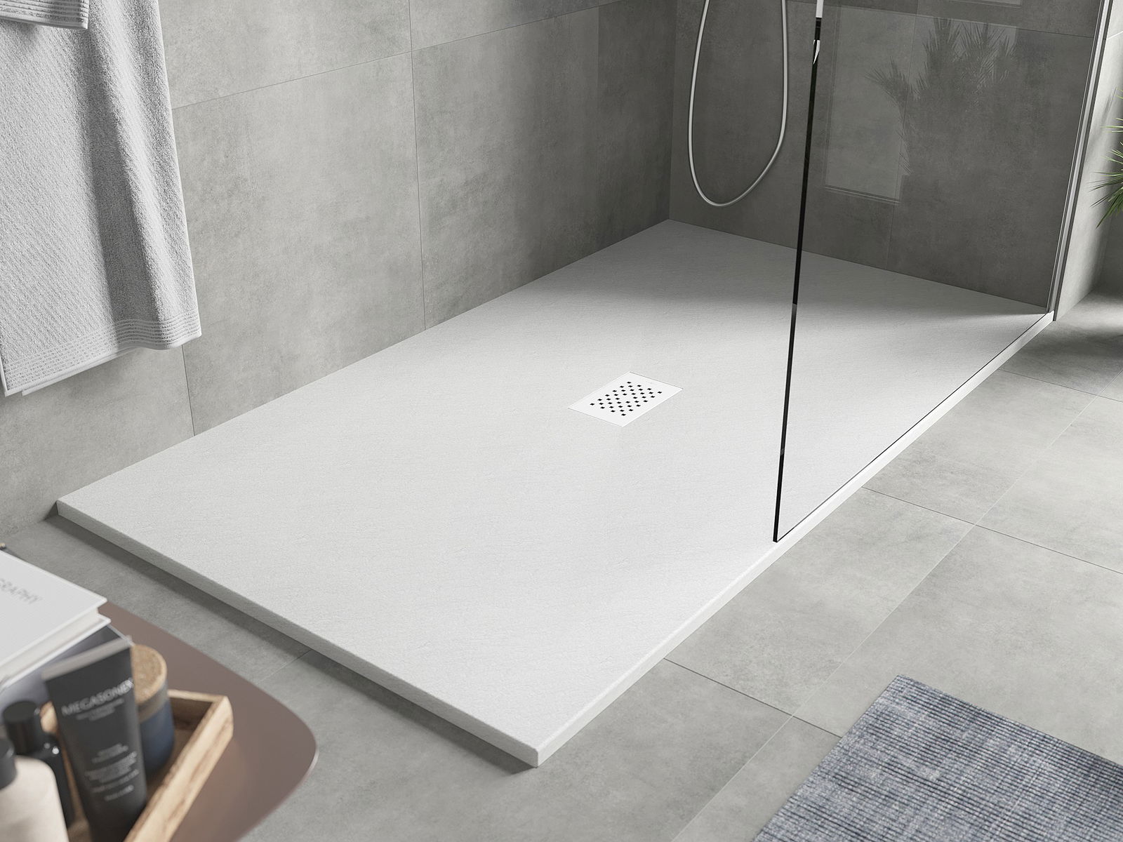 La surface du receveur de douche rappelle par sa structure la pierre. Elle constitue une combinaison exceptionnelle d'un aspect naturel et d'un aménagement intérieur moderne. Elle ajoute du caractère, souligne l'esthétique et l'élégance de la décoration de la salle de bains et séduit par sa forme.
