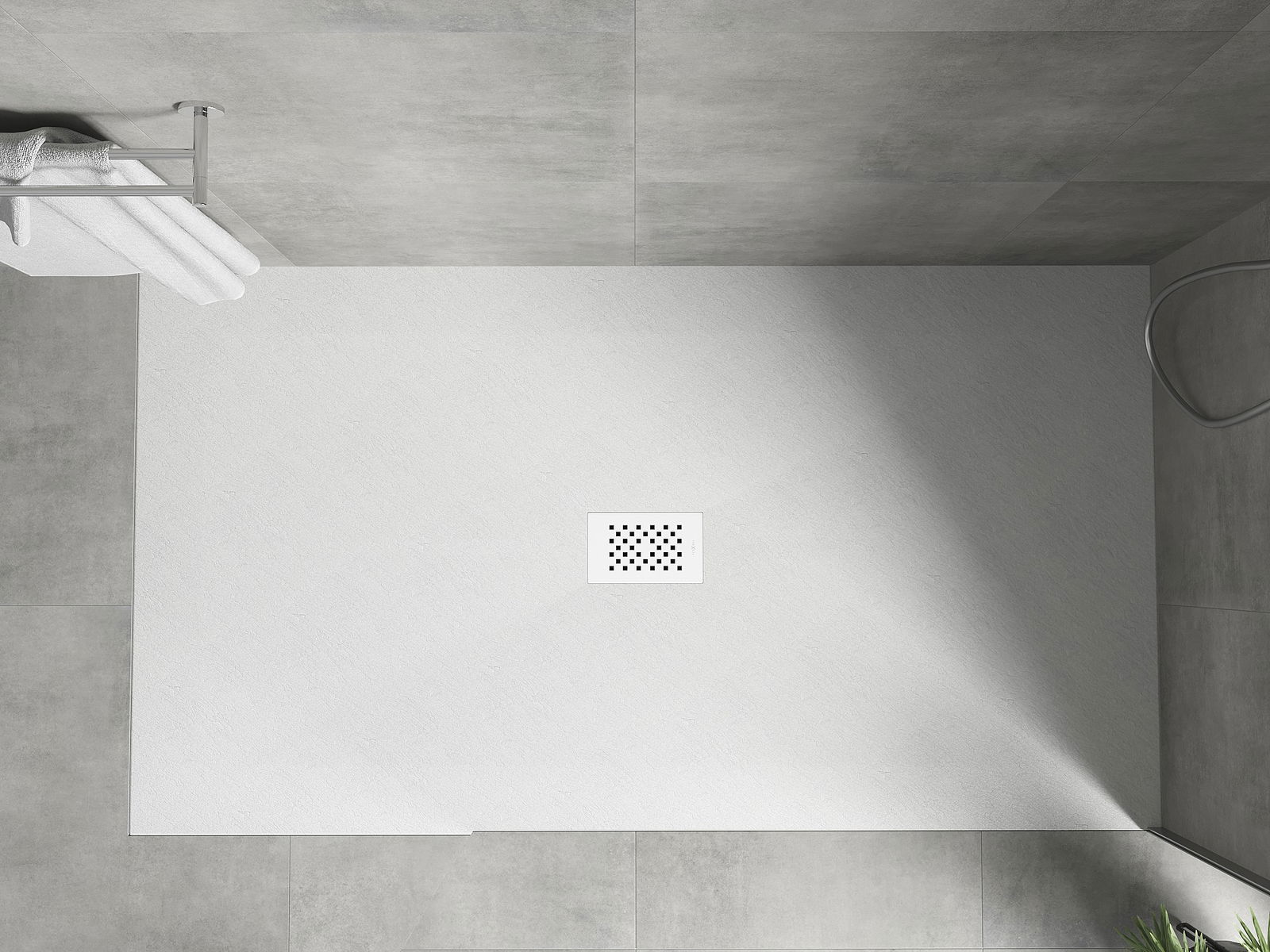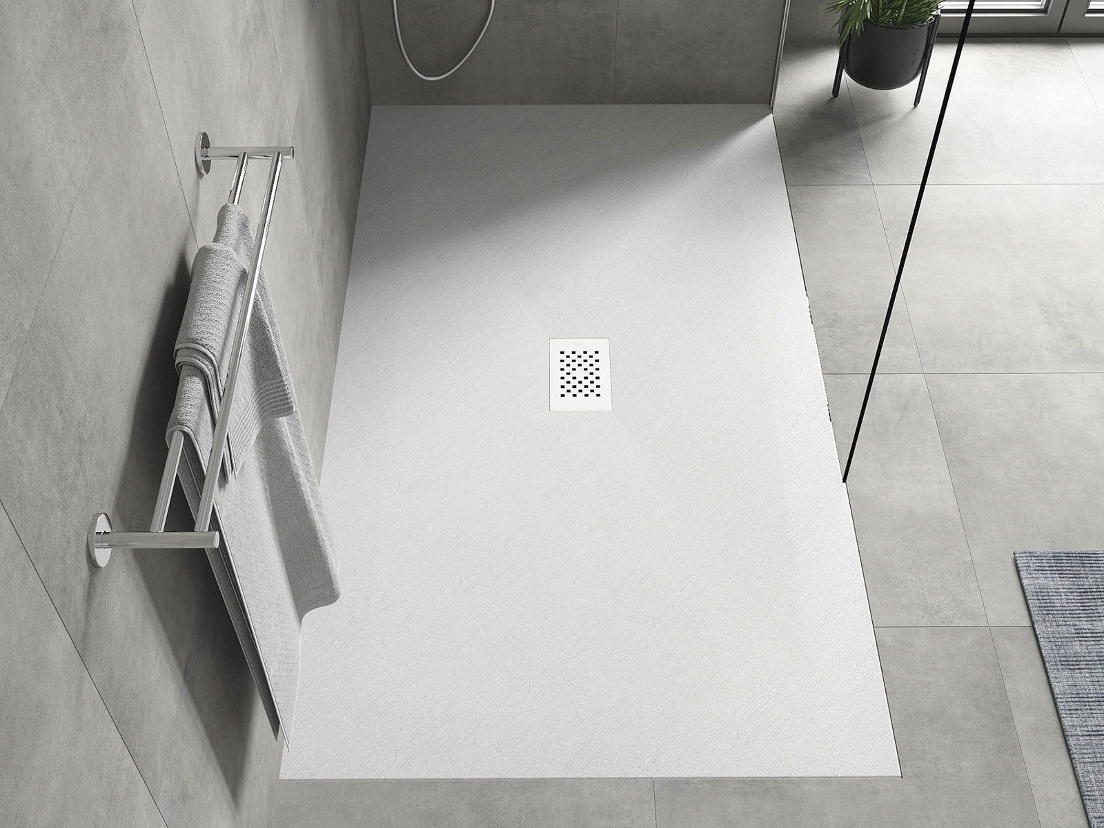 La surface du receveur de douche rappelle par sa structure la pierre. Elle constitue une combinaison exceptionnelle d'un aspect naturel et d'un aménagement intérieur moderne. Elle ajoute du caractère, souligne l'esthétique et l'élégance de la décoration de la salle de bains et séduit par sa forme.
