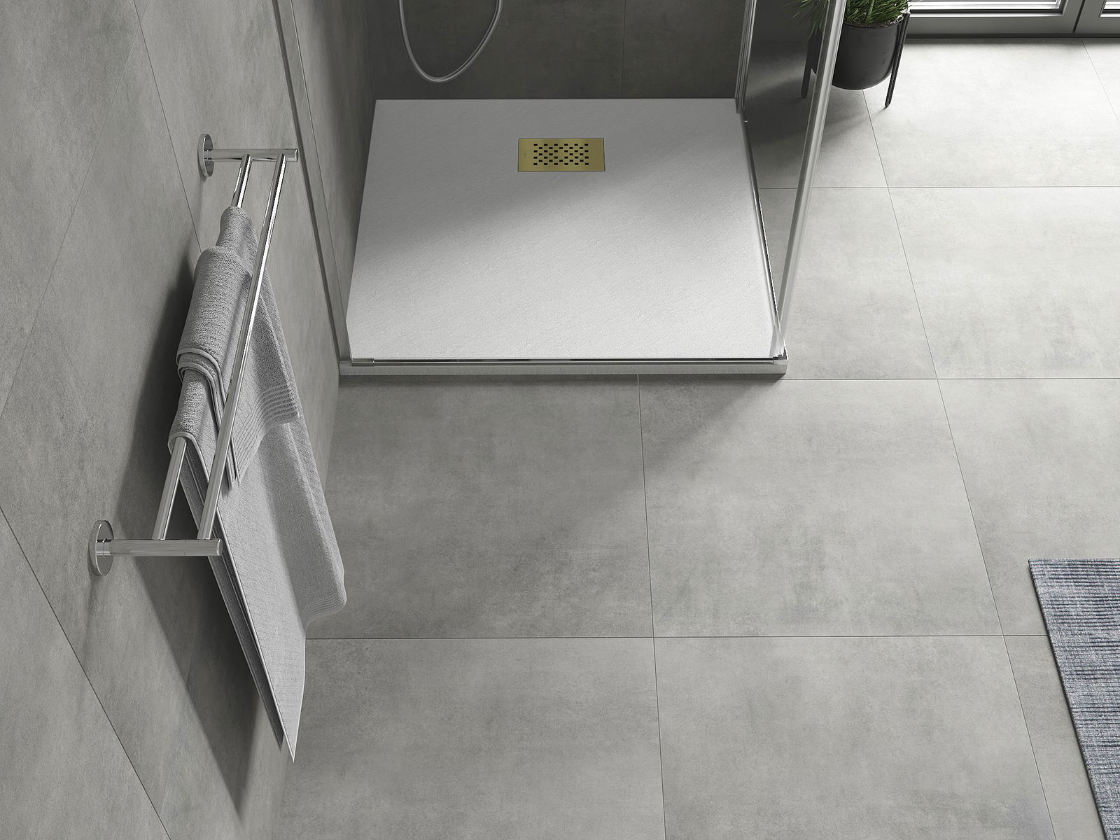 La surface du receveur de douche évoque la pierre. C'est une combinaison unique d'aspect naturel et de design intérieur moderne. Il ajoute du caractère, souligne l'esthétique et l'élégance de la salle de bains et séduit par sa forme.