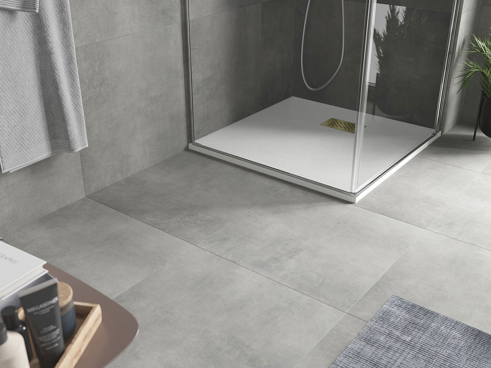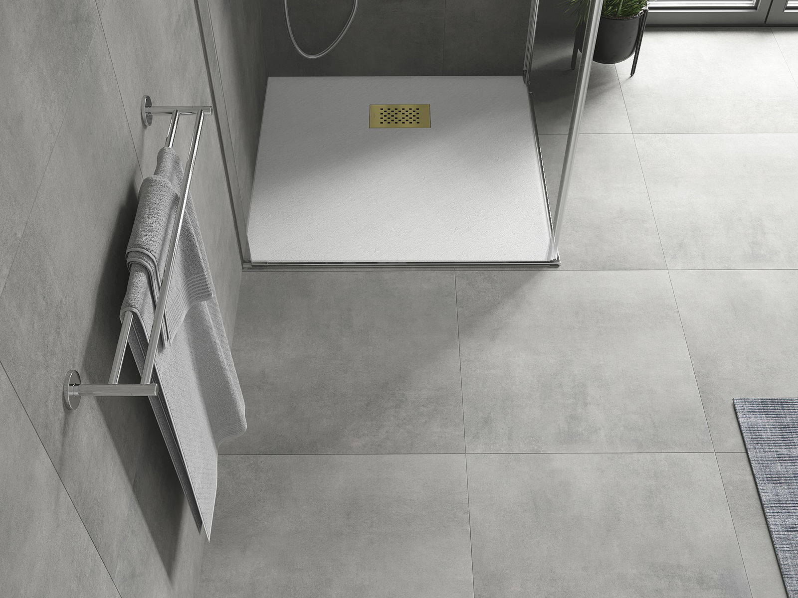La surface du receveur de douche évoque la pierre. C'est une combinaison unique d'aspect naturel et de design intérieur moderne. Il ajoute du caractère, souligne l'esthétique et l'élégance de la salle de bains et séduit par sa forme.
