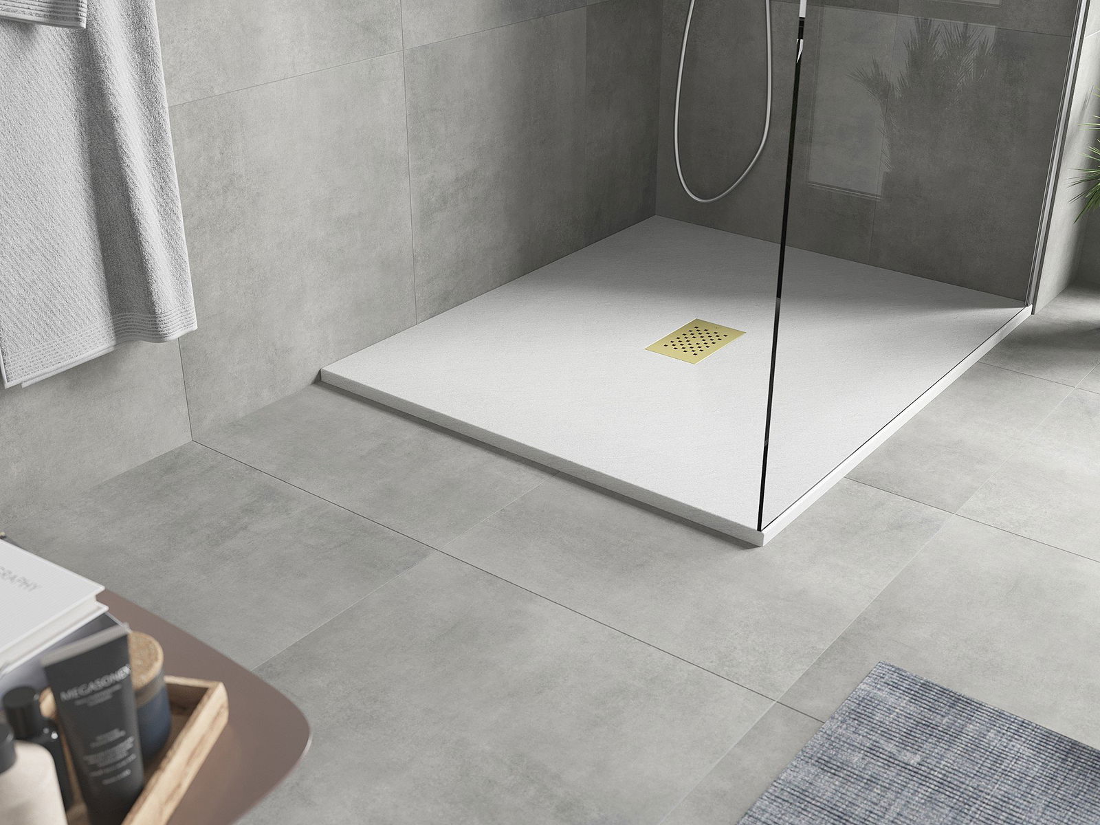 La surface du receveur de douche évoque la pierre. C'est une combinaison unique d'aspect naturel et de design intérieur moderne. Il ajoute du caractère, souligne l'esthétique et l'élégance de la salle de bains et séduit par sa forme.