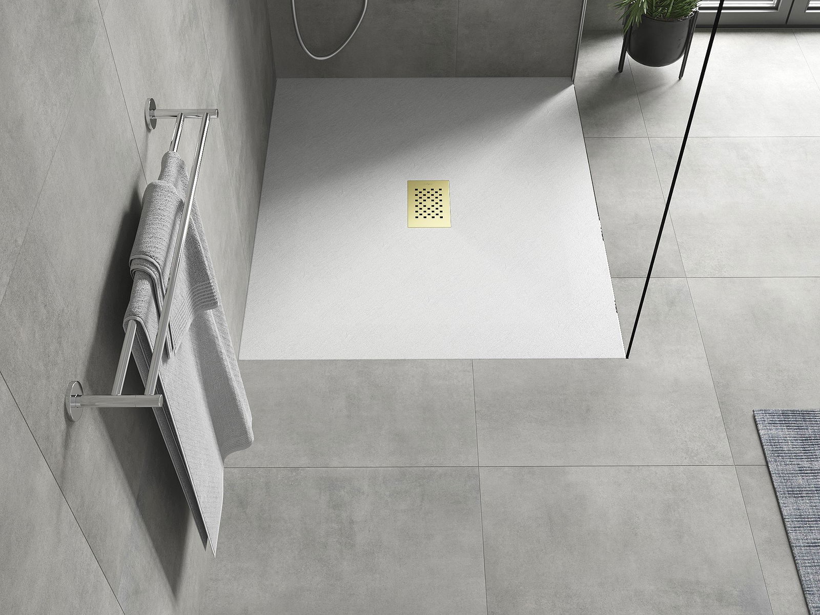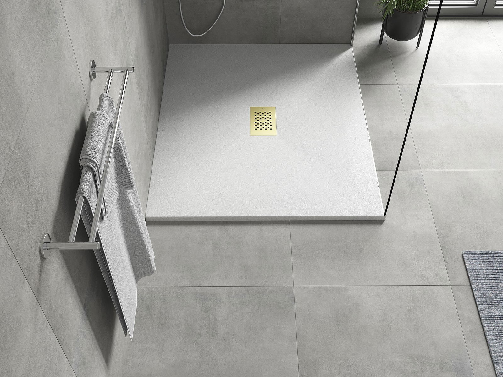 La surface du receveur de douche évoque la pierre. C'est une combinaison unique d'aspect naturel et de design intérieur moderne. Il ajoute du caractère, souligne l'esthétique et l'élégance de la salle de bains et séduit par sa forme.