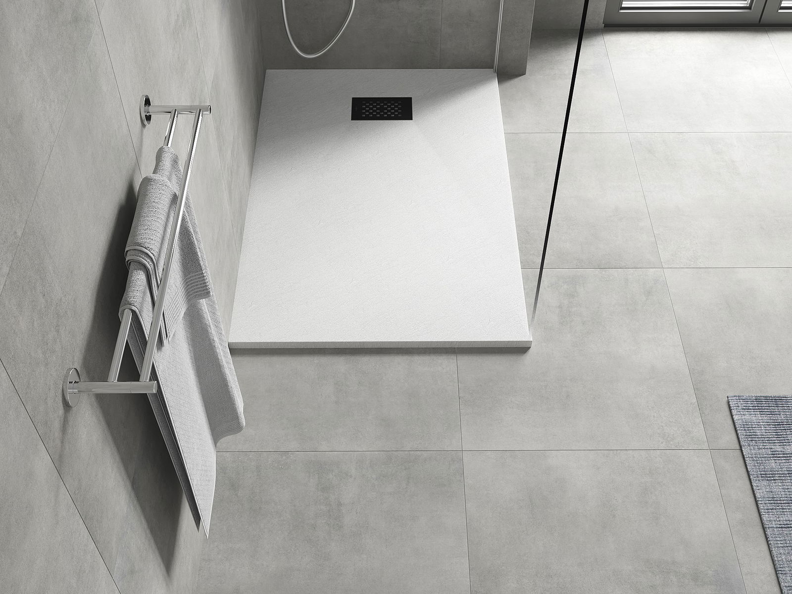 La surface du receveur de douche évoque la pierre. C'est une combinaison unique d'aspect naturel et de design intérieur moderne. Il ajoute du caractère, souligne l'esthétique et l'élégance de la salle de bains et séduit par sa forme.