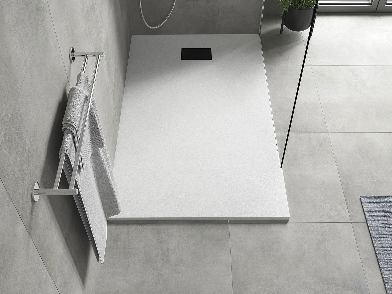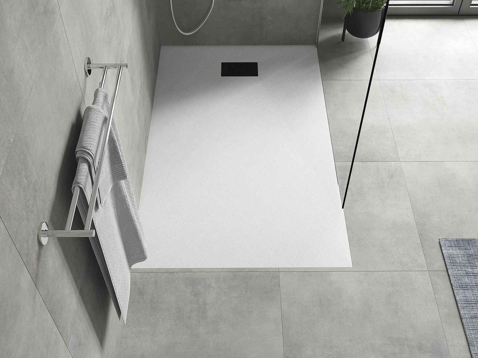 La surface du receveur de douche rappelle par sa structure la pierre. Elle constitue une combinaison exceptionnelle d'un aspect naturel et d'un aménagement intérieur moderne. Elle ajoute du caractère, souligne l'esthétique et l'élégance de la décoration de la salle de bains et séduit par sa forme.