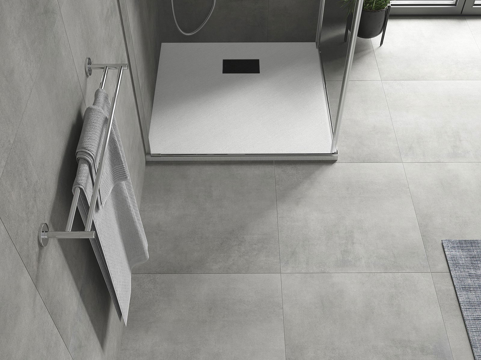 La surface du receveur de douche évoque la pierre. C'est une combinaison unique d'aspect naturel et de design intérieur moderne. Il ajoute du caractère, souligne l'esthétique et l'élégance de la salle de bains et séduit par sa forme.