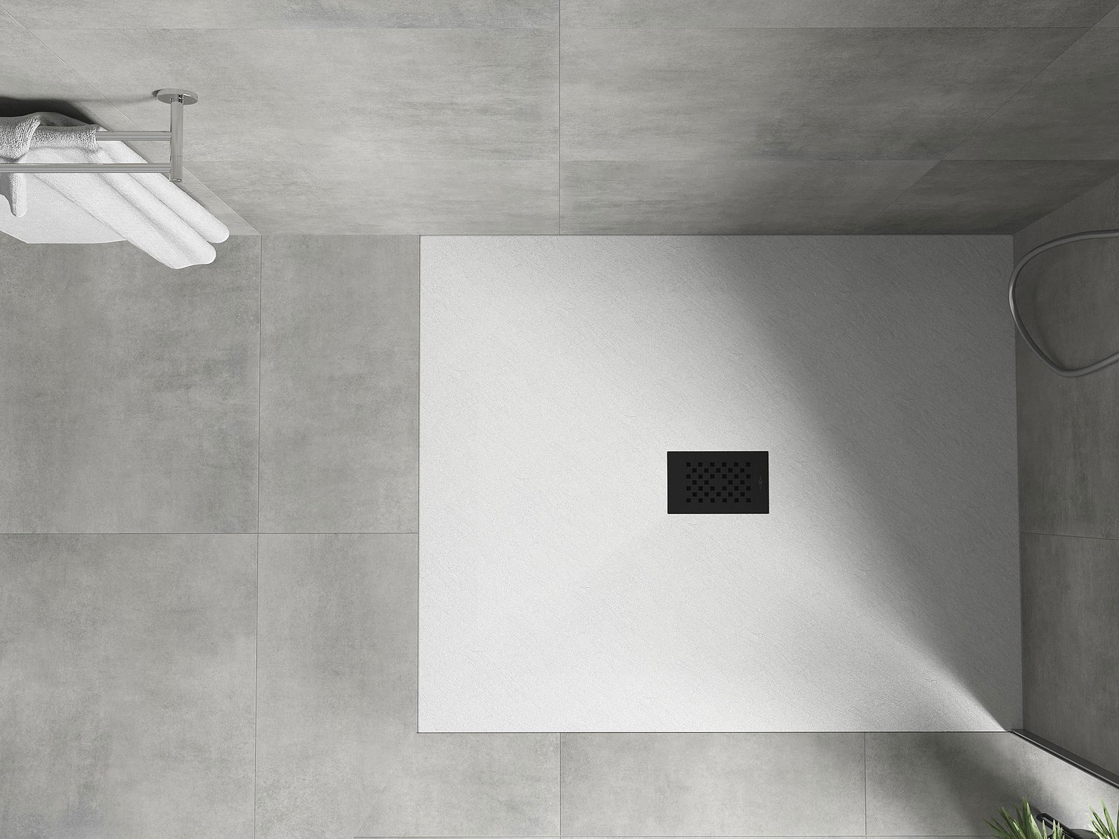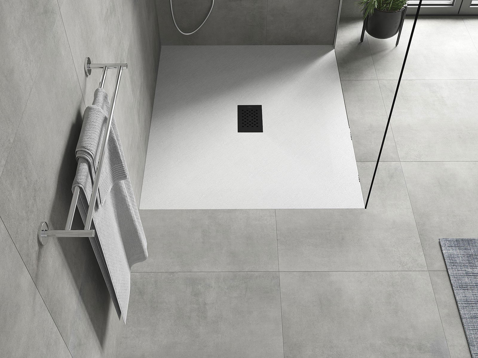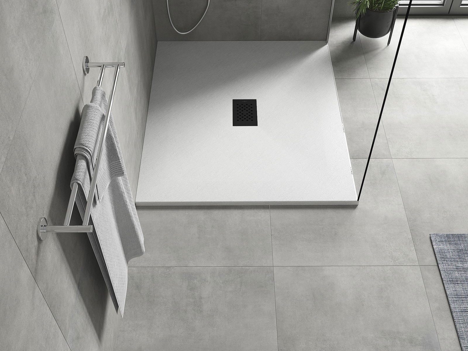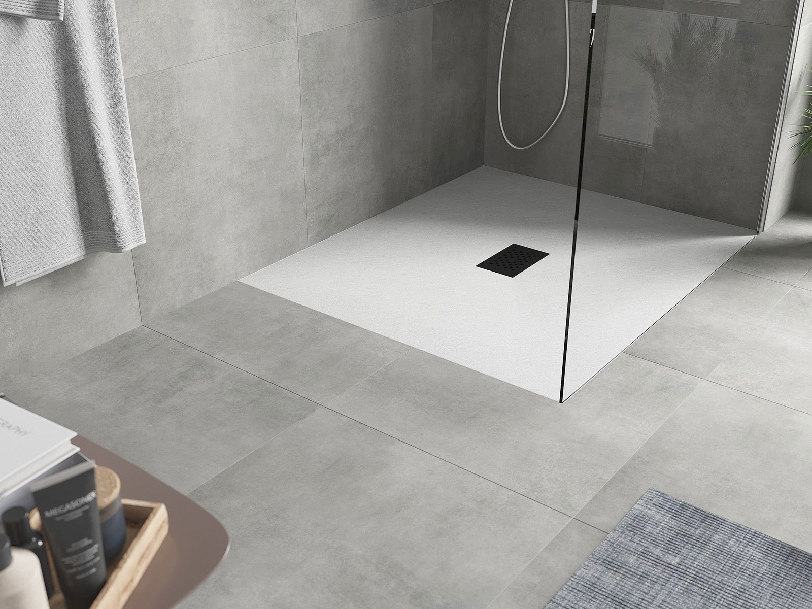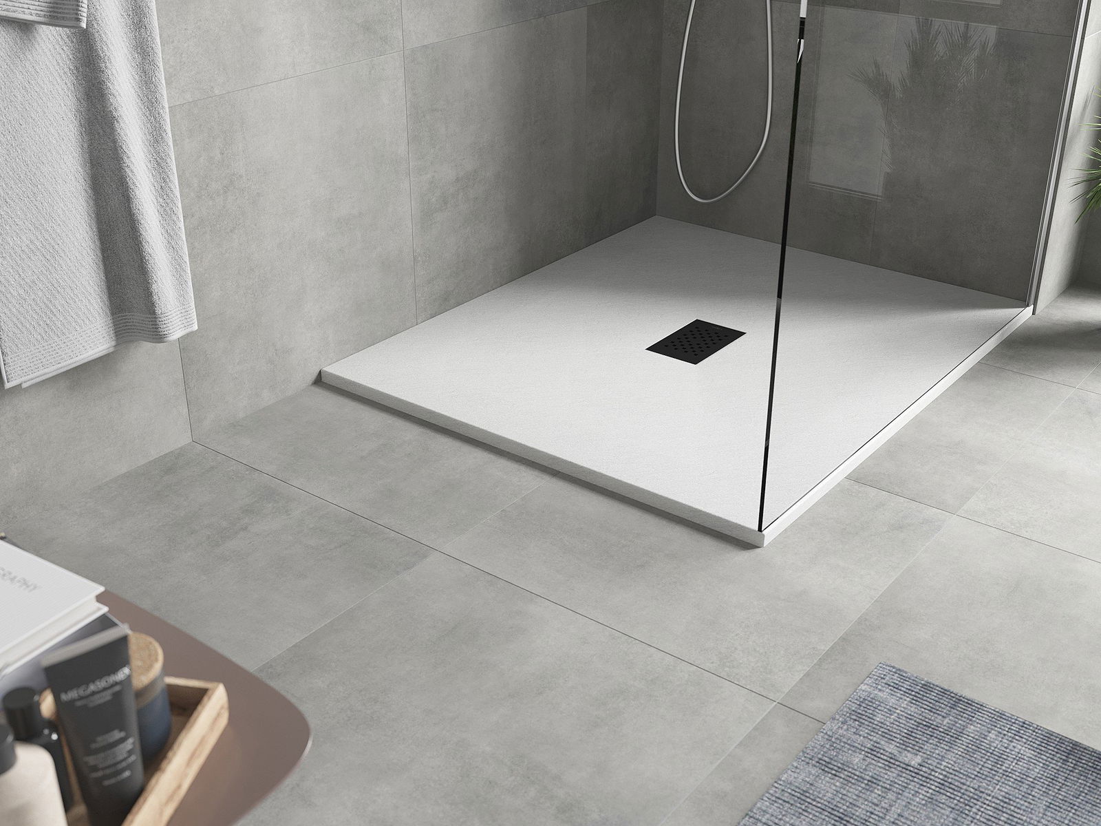 La surface du receveur de douche évoque la pierre. C'est une combinaison unique d'aspect naturel et de design intérieur moderne. Il ajoute du caractère, souligne l'esthétique et l'élégance de la salle de bains et séduit par sa forme.